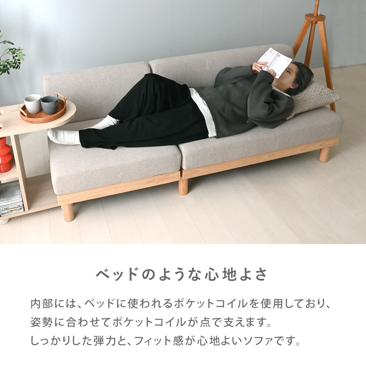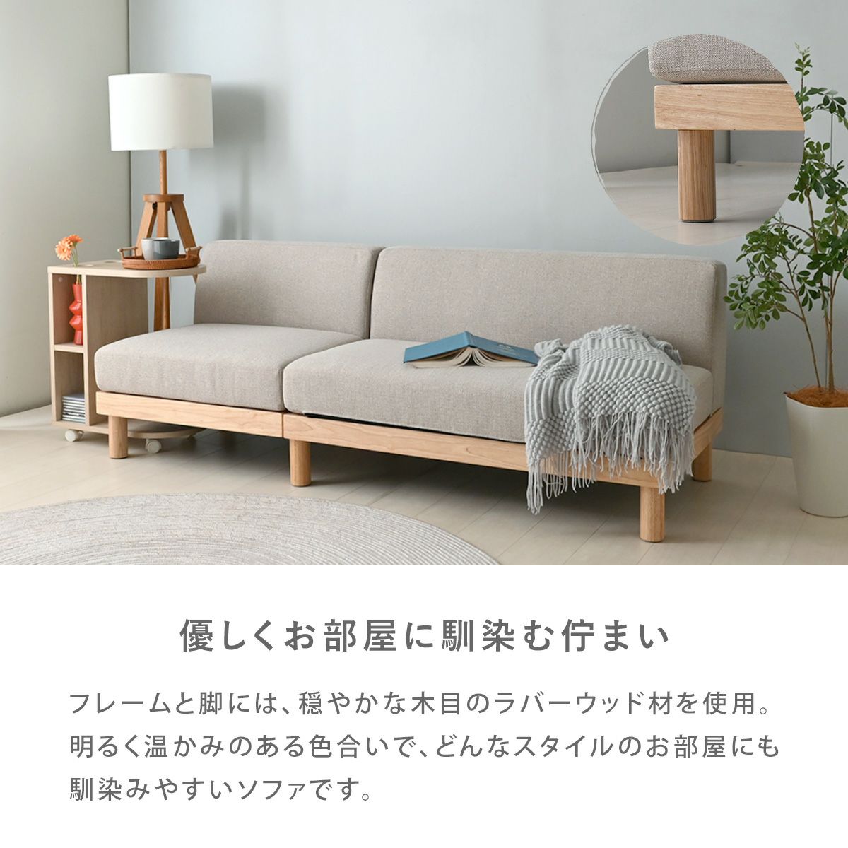 穏やかな木目と明るく温かみのある座面が特徴のソファです。ゆったりとした広々サイズで、3人並んで座ることもでき、さらっとした肌触りのファブリックを使用しているので、季節を問わず快適にお使いいただけます。座面の向きを変えるだけで自由にレイアウトできるので、フレームを動かす手間がなく、気分やシーンに合わせて簡単に居心地の良い空間を作ることができます。