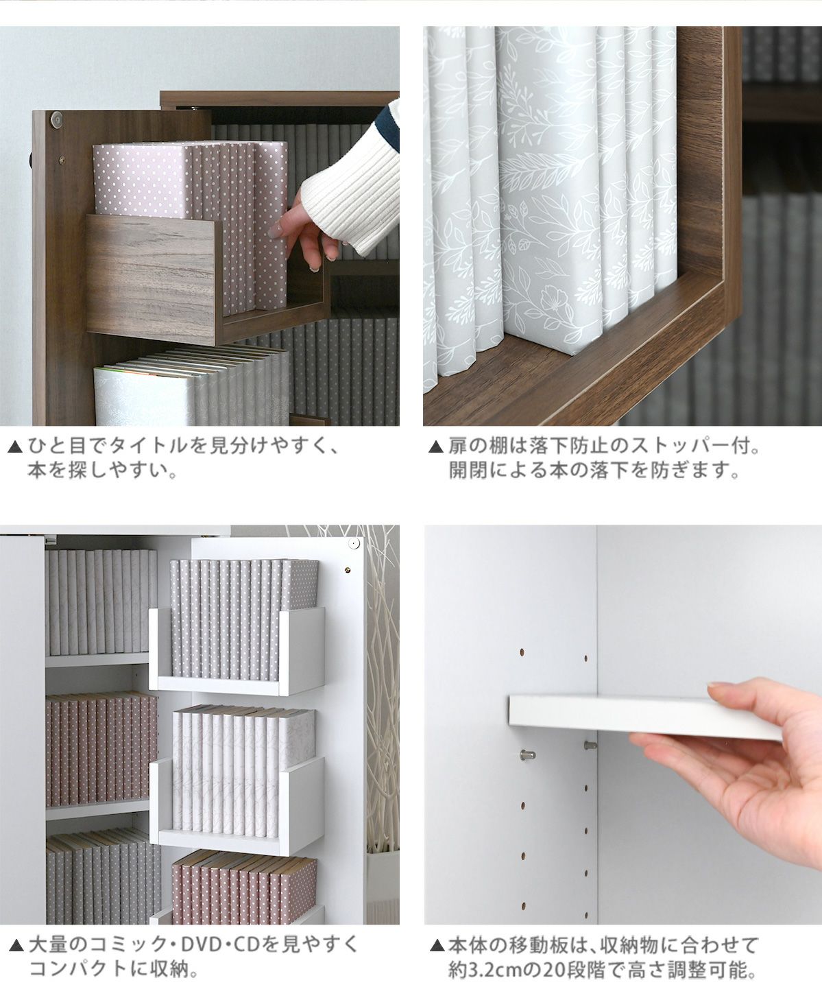 他の画像を見る 本棚 大容量 扉付き 隠す収納 幅90 奥行40 4段 棚 木製 カラーボックス コミックラック 収納ラック 漫画 単行本 文庫本 ブックシェルフ シンプル 白 ホワイト 木目調 ブラウン リビング 扉付本棚 コミックラック<VJ97-90> お気に入りに登録する 当店特別価格 ¥ 24,940 税込 NEW ホワイト ブラック ブラウン