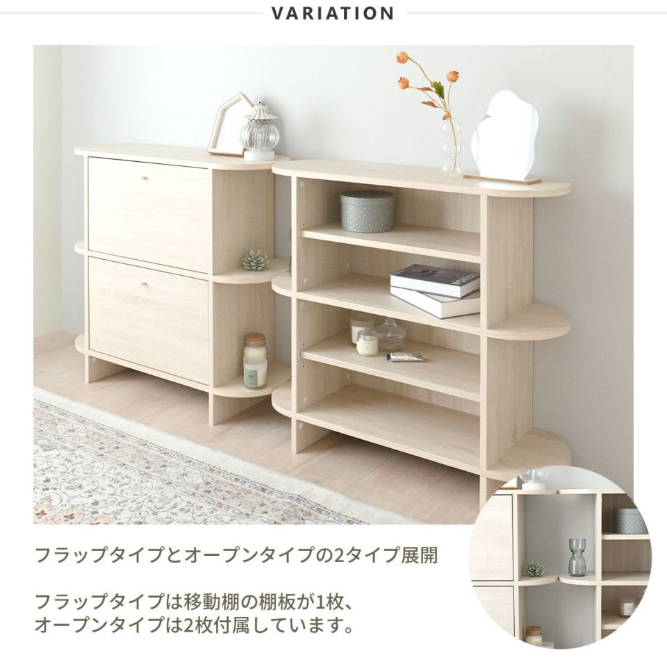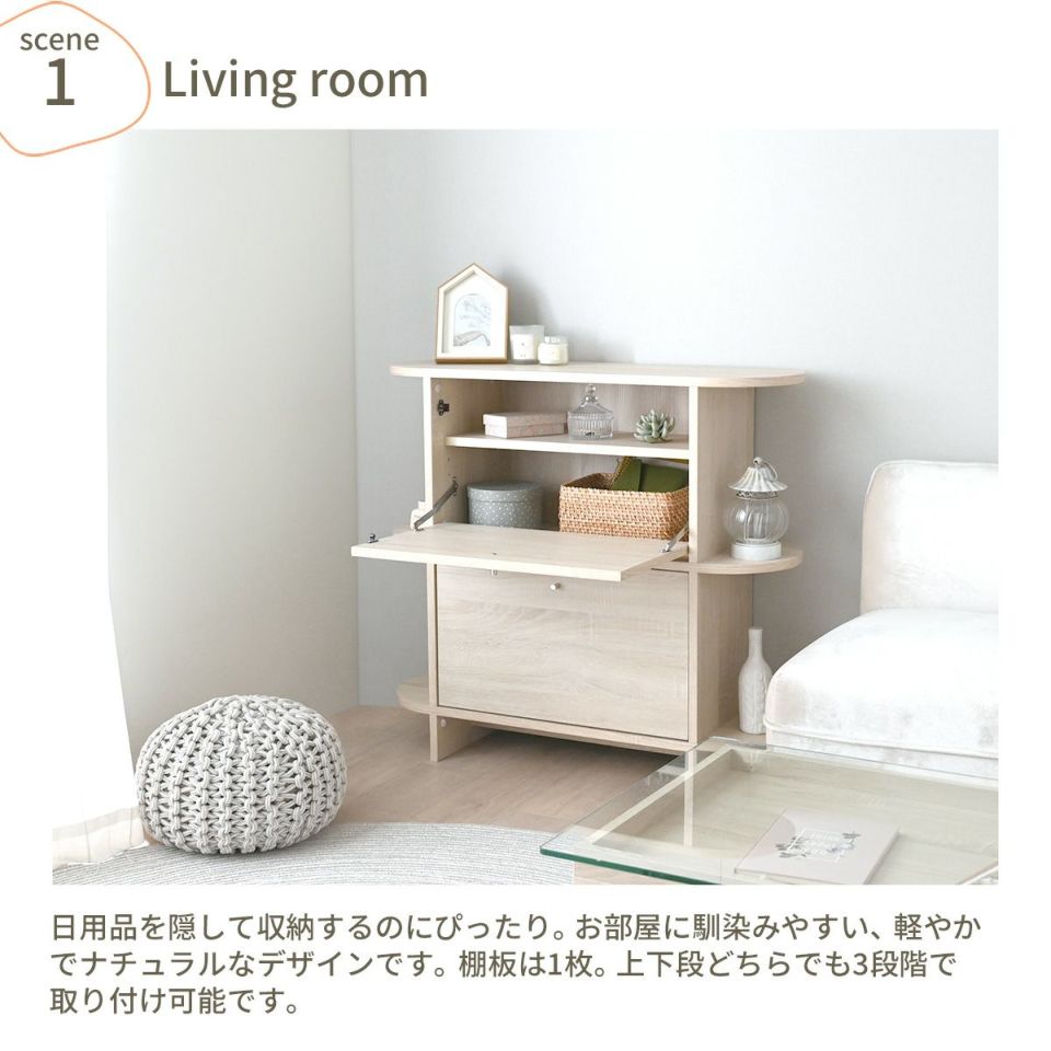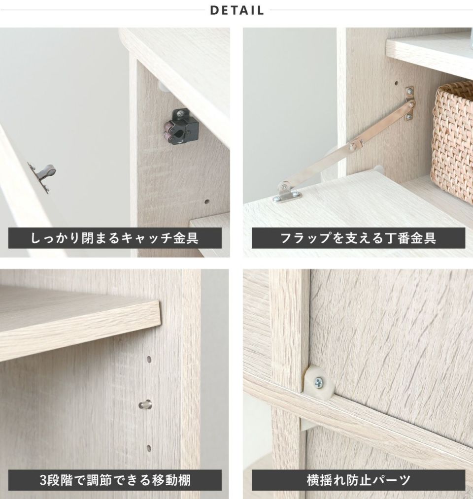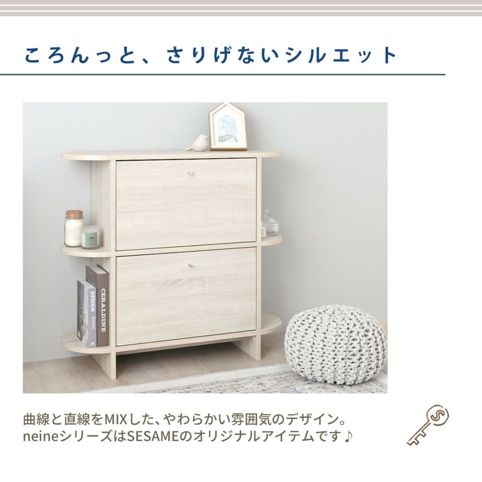 やわらかい雰囲気とシルエットが可愛いneine(ネイン)シリーズ。日用品を隠して収納できるフラップ扉収納。