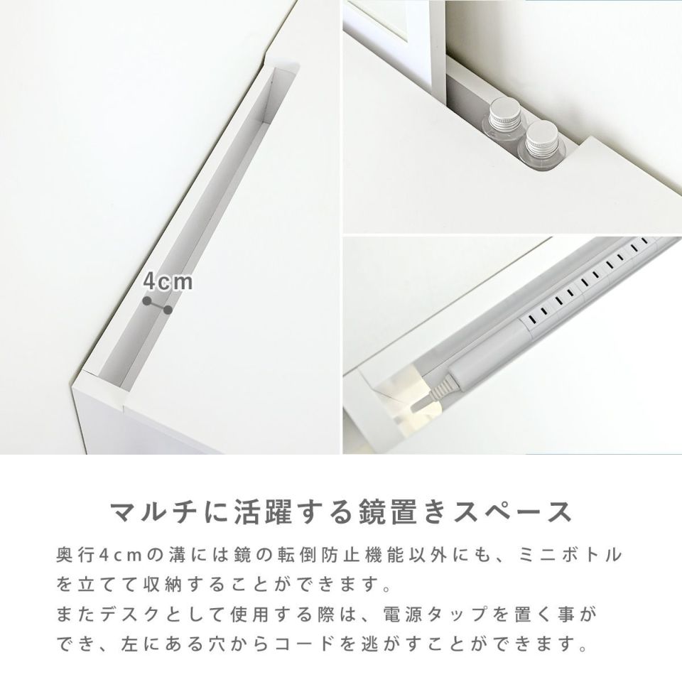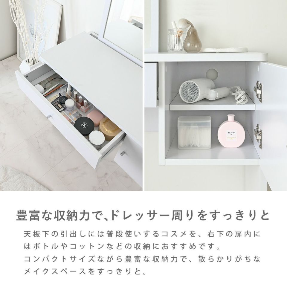 マットなホワイトとラウンド型のミラーが特徴的なドレッサーテーブルです。引き出しには普段使いするコスメを収納でき、右側の扉内にはボトルやコットン、ドライヤーなども収納可能です。ミラーは上半身までしっかりと見える大きさで、メイクからヘアセットまで快適に身支度できます。鏡を取り外せばデスクとしてお使いいただくことができ、鏡置きスペースに電源タップを設置できるので、幅広いシーンで活躍します。