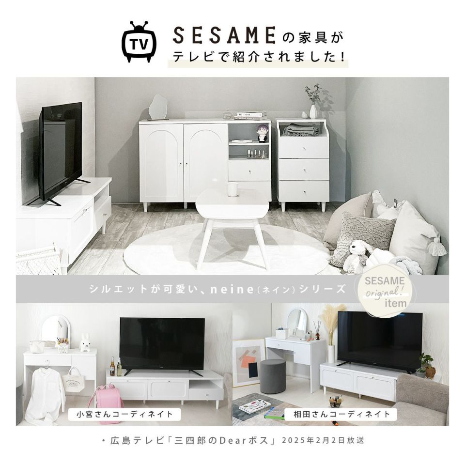 やわらかい雰囲気とシルエットが可愛いneine(ネイン)シリーズ。幅90cm、コンパクトなサイズ感のドレッサー。マットなホワイトとラウンド型のミラーが特徴的なドレッサーテーブルです。引き出しには普段使いするコスメを収納でき、右側の扉内にはボトルやコットン、ドライヤーなども収納可能です。ミラーは上半身までしっかりと見える大きさで、メイクからヘアセットまで快適に身支度できます。鏡を取り外せばデスクとしてお使いいただくことができ、鏡置きスペースに電源タップを設置できるので、幅広いシーンで活躍します。