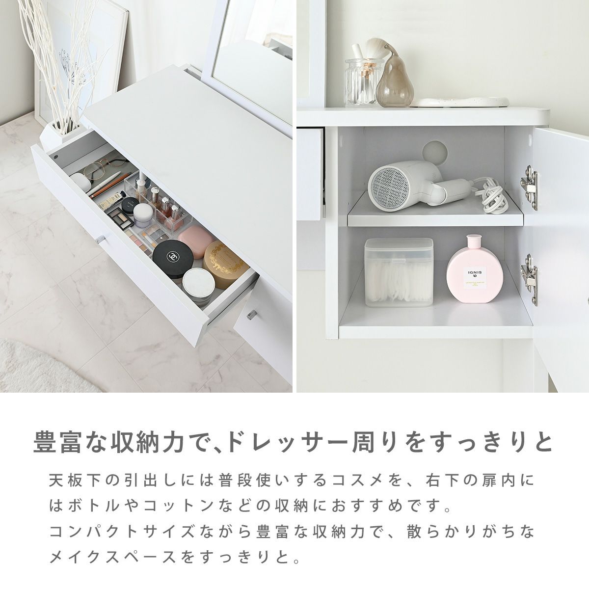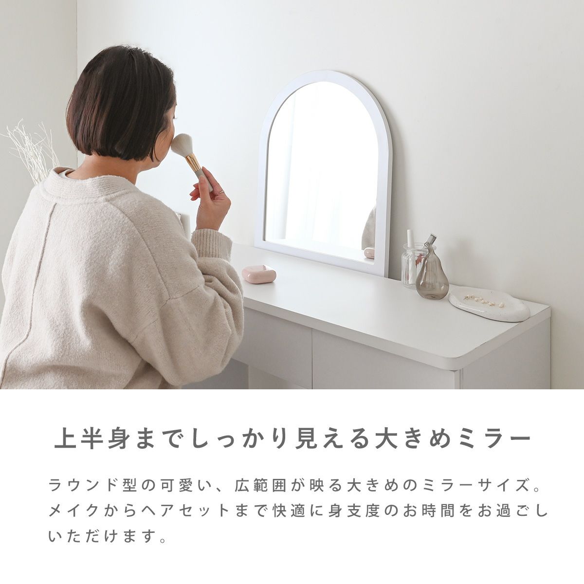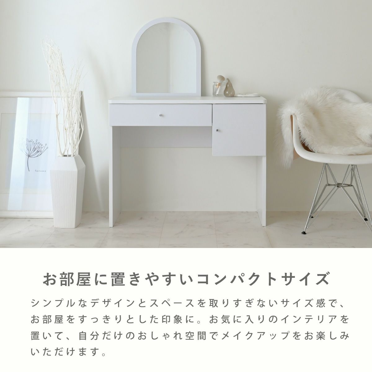 他の画像を見る ドレッサー ドレッサーデスク デスク ミラー ラウンド型ミラー 北欧 おしゃれ 幅90 ホワイト 引き出し付 収納 扉収納 シンプル ナチュラル メイク ヘアセット コスメ neine(ネイン)ドレッサー NIN73-90D お気に入りに登録する 当店特別価格 ¥ 18,990 税込 NEW ホワイト