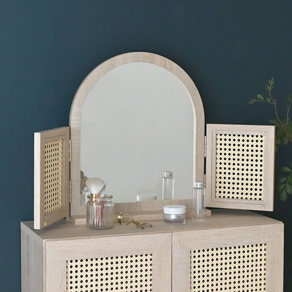 ラタン素材がアクセントのNONIER(ノニエ)シリーズ。デスクや玄関、様々な場所にあると便利な大型置き型ミラー。