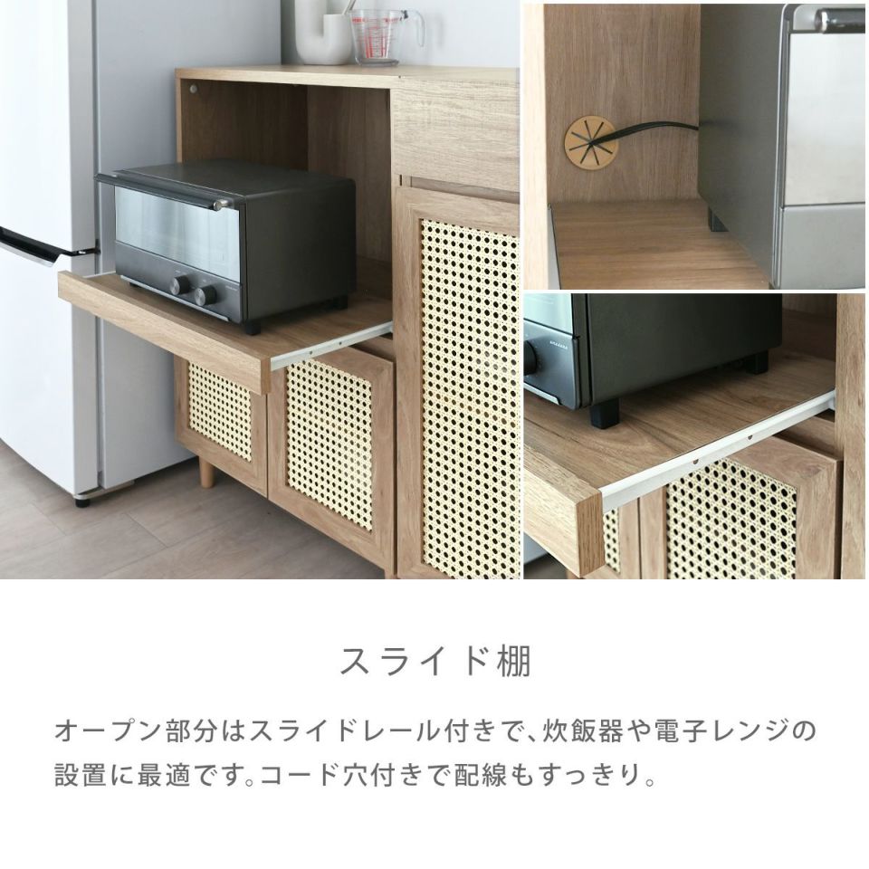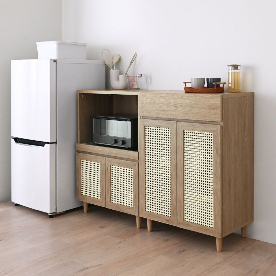 グレーがかったナチュラルの木目とラタンの組み合わた、NONIER(ノニエ)のレンジボード。 食器やコップはもちろん、鍋やストック品の収納にも便利で、広々とした天板は作業スペースとしても最適です。 スライド棚には炊飯器やケトル、電子レンジを設置することができます。 かごめ編みのPVCラタンを使用しているので湿気やにおいがこもりにくく、汚れもサッと水拭きできるので衛生的で、シリーズで揃えて使用すれば統一感のあるお部屋を演出できます。