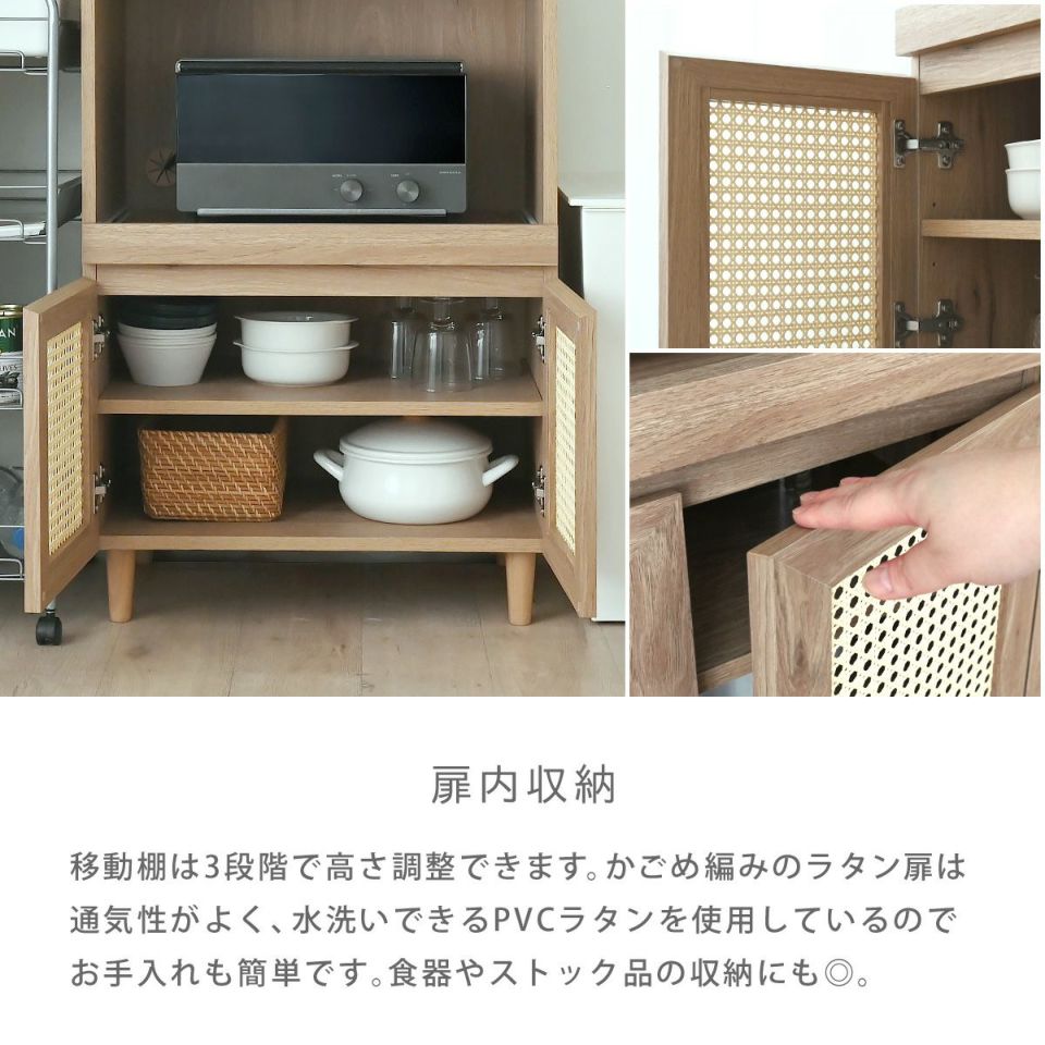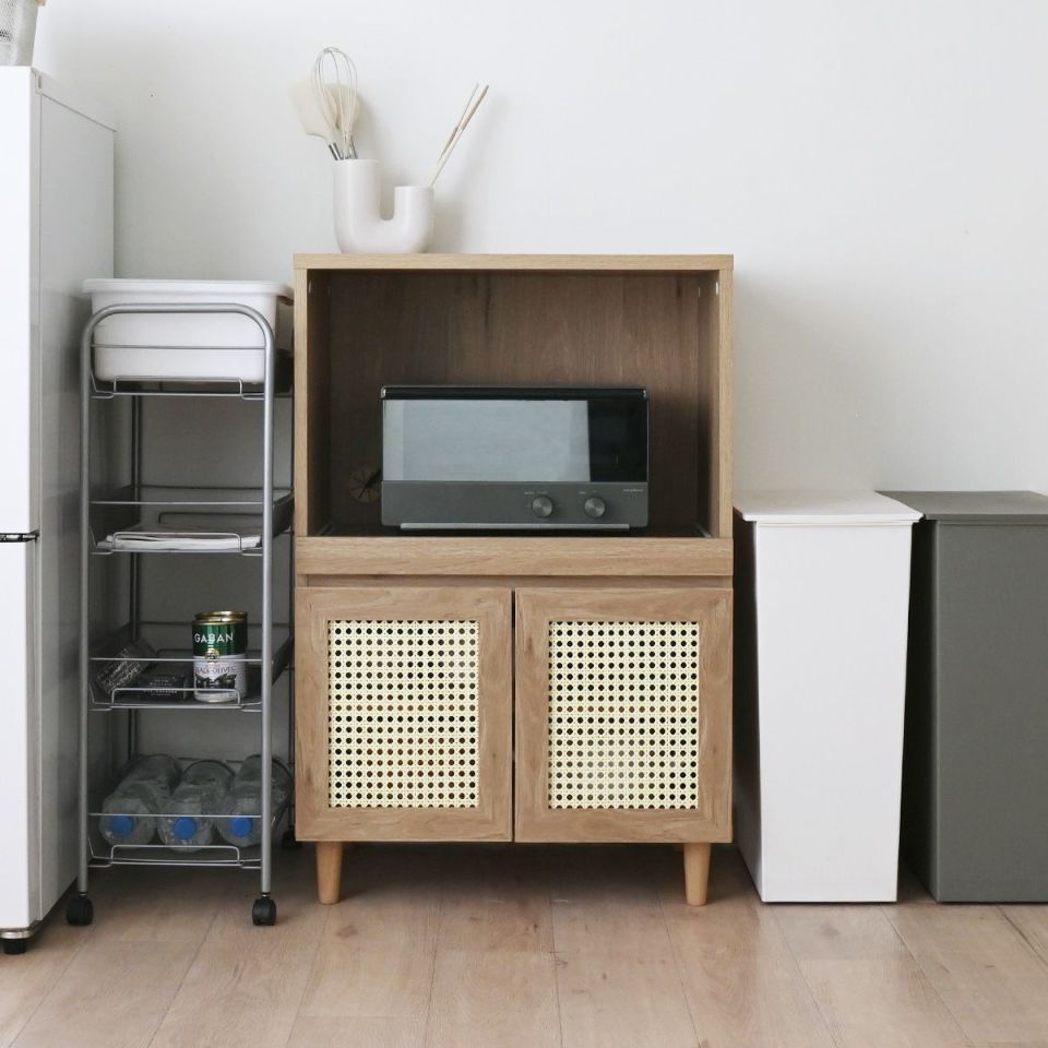 落ち着いたナチュラルの木目とラタンがおしゃれ。幅60cmのコンパクトなキッチン収納。