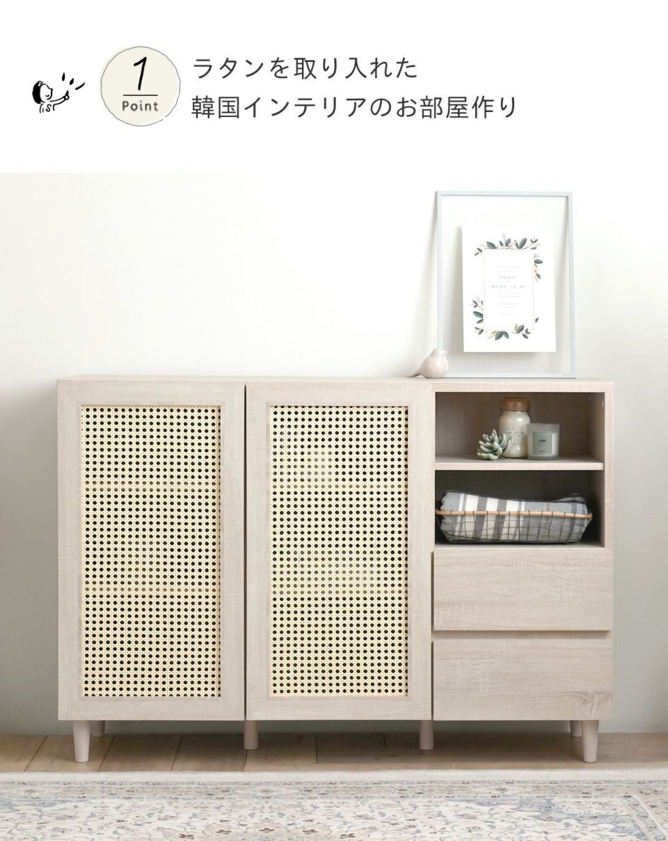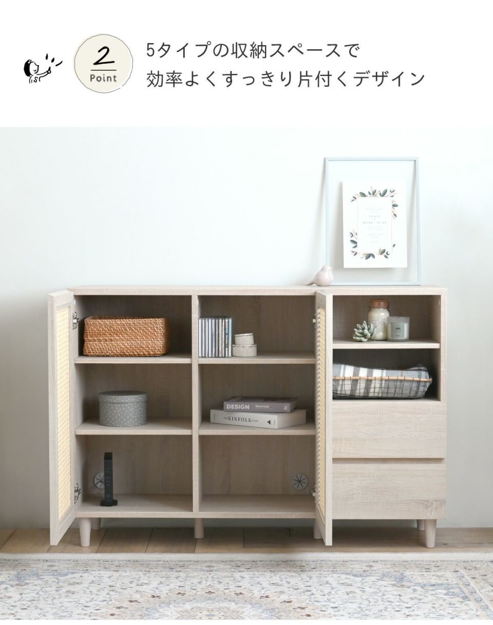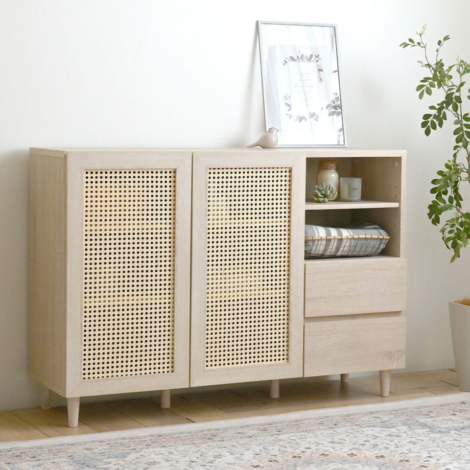 ラタン素材がアクセントのNONIER(ノニエ)シリーズ。幅120cm、大容量収納のリビングボード。