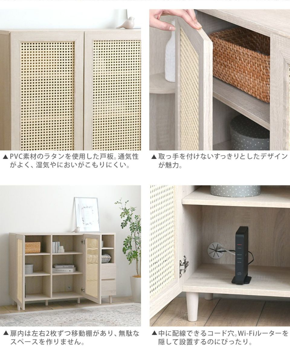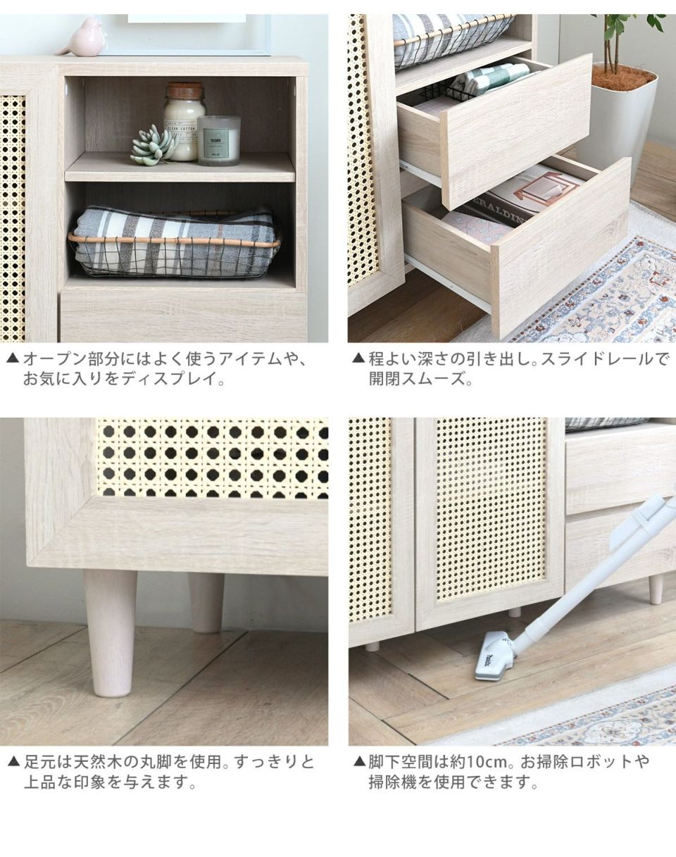 ナチュラルな木目とラタン素材がおしゃれなキャビネットです。かごめ編みのラタンは通気性がよく、湿気やにおいがこもりにくくなっています。PVCラタンを使用しているのでサッと水拭きするだけで綺麗に使うことができ、お手入れも簡単です。オープン部分はディスプレイとしても使うことができ、引き出し部分は日用品などを収納して生活感を隠すことができます。お部屋に馴染みやすいナチュラルなデザインで、リビングやキッチン、玄関など様々な場所の収納アイテムとしてお使いいただけます。