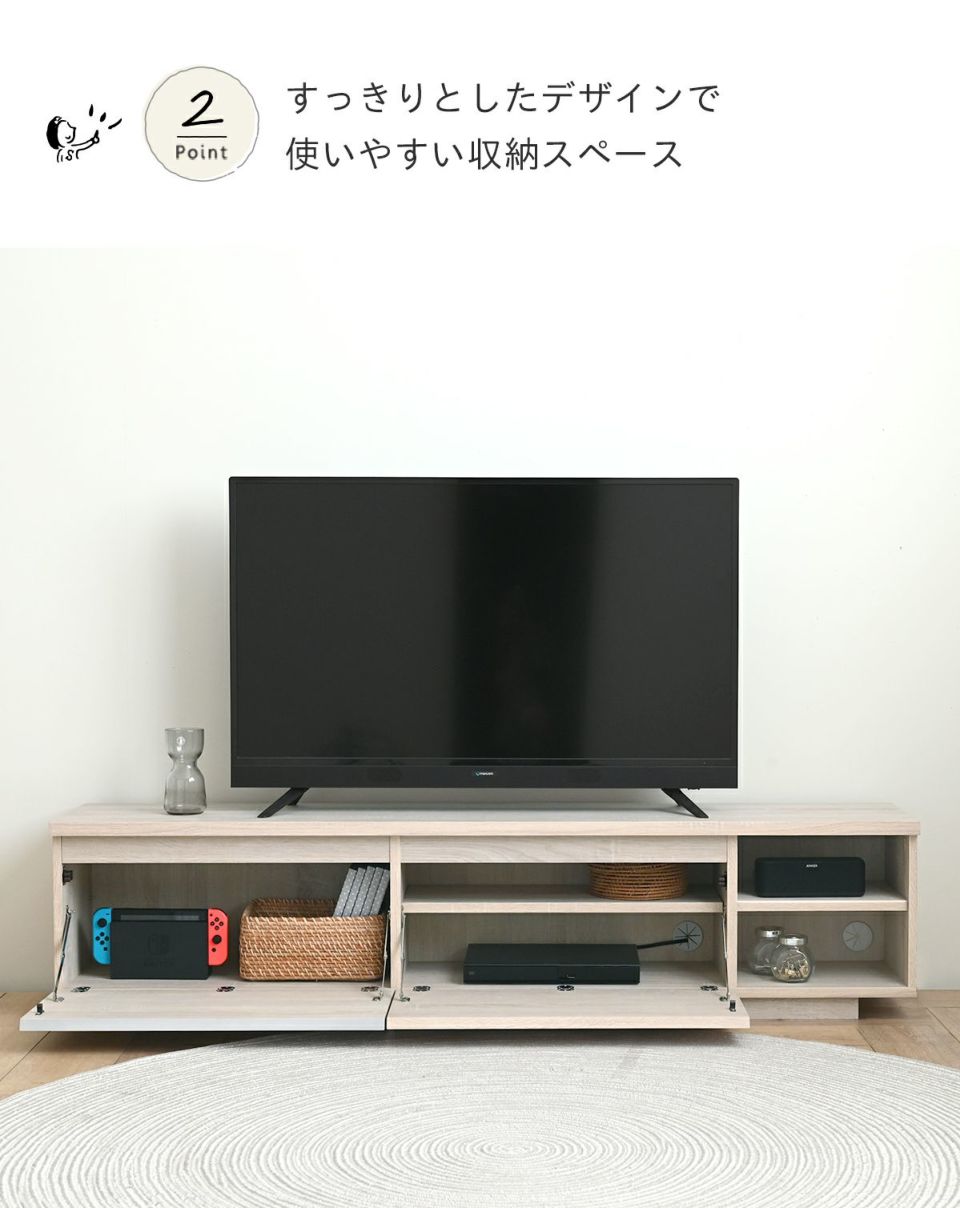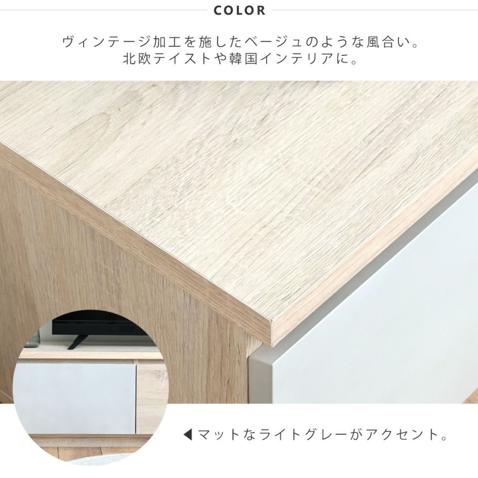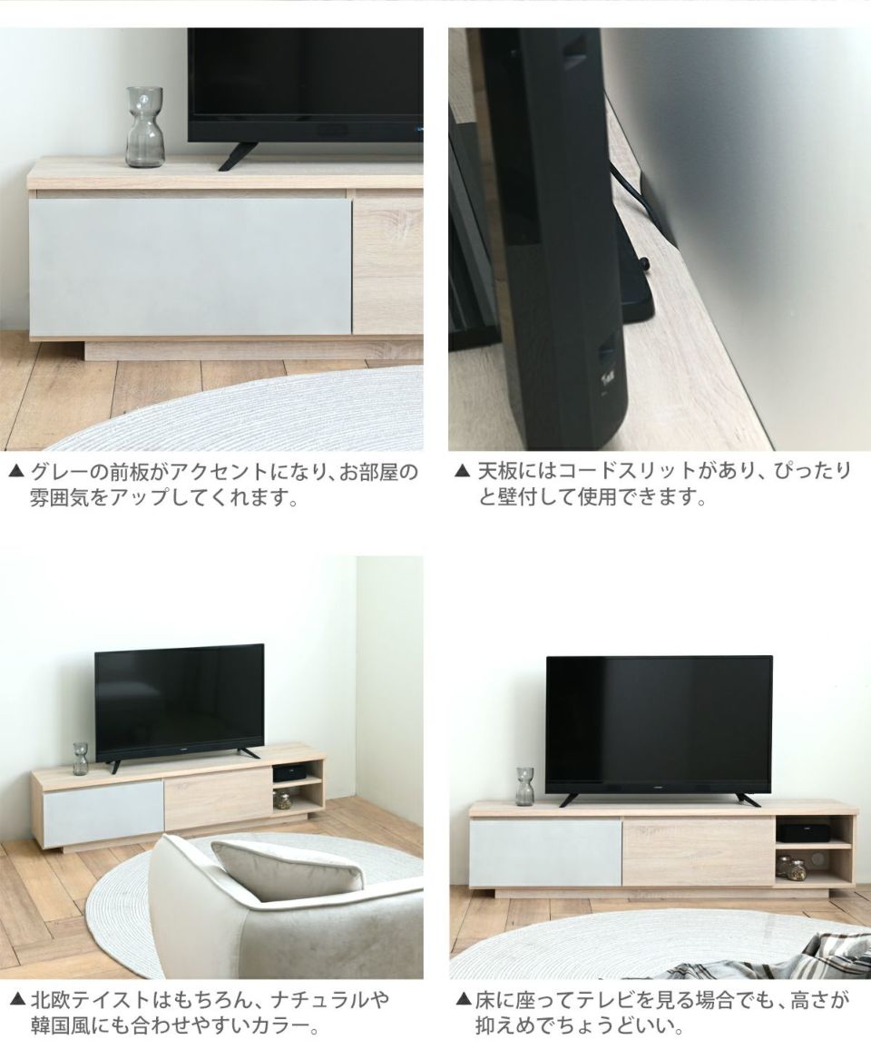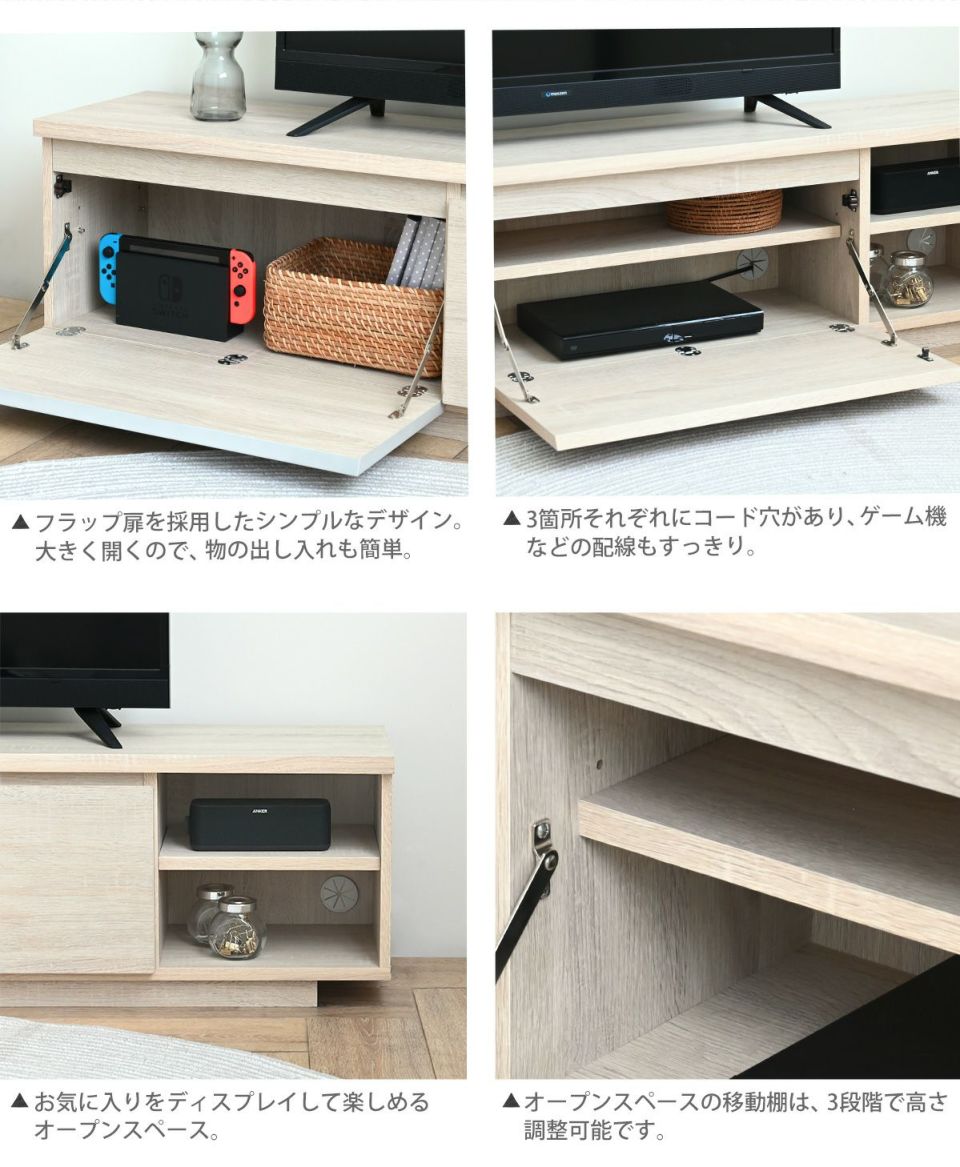 ナチュラルな木目とグレーのバランスがおしゃれなテレビボード。フラップ扉の中は広々としており、ゲーム機やWi-Fiなど様々なものを収納することができます。奥まで見える下開きの扉が使いやすく、コード穴も3つ付いているので大変便利です。シンプルなデザインがどんなインテリアにも合わせやすく、様々なシーンでお使いいただけます。