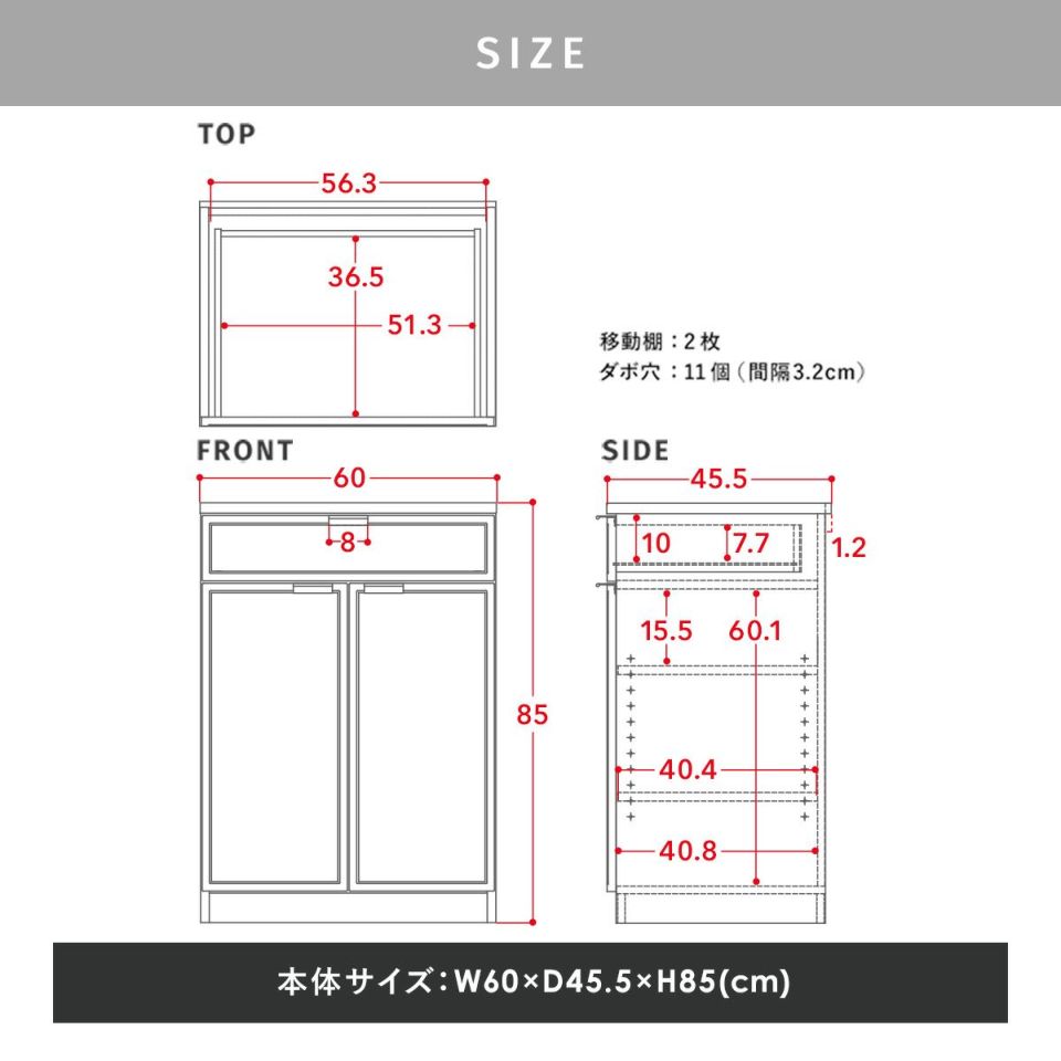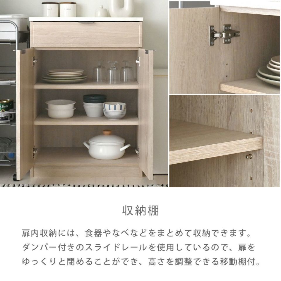 大容量の収納スペースを持った機能性の高いキッチンボード。広々とした奥行きがあり、天板は低圧メラミンを使用しているので傷や汚れ、熱にも強く、作業スペースとしてもお使いいただけます。扉内収納には、食器やコップはもちろん、鍋やストック品なども収納できるのでごちゃごちゃしがちなキッチンをすっきりと見せることができます。シリーズで揃えて使用すれば統一感のあるお部屋を演出することができます。