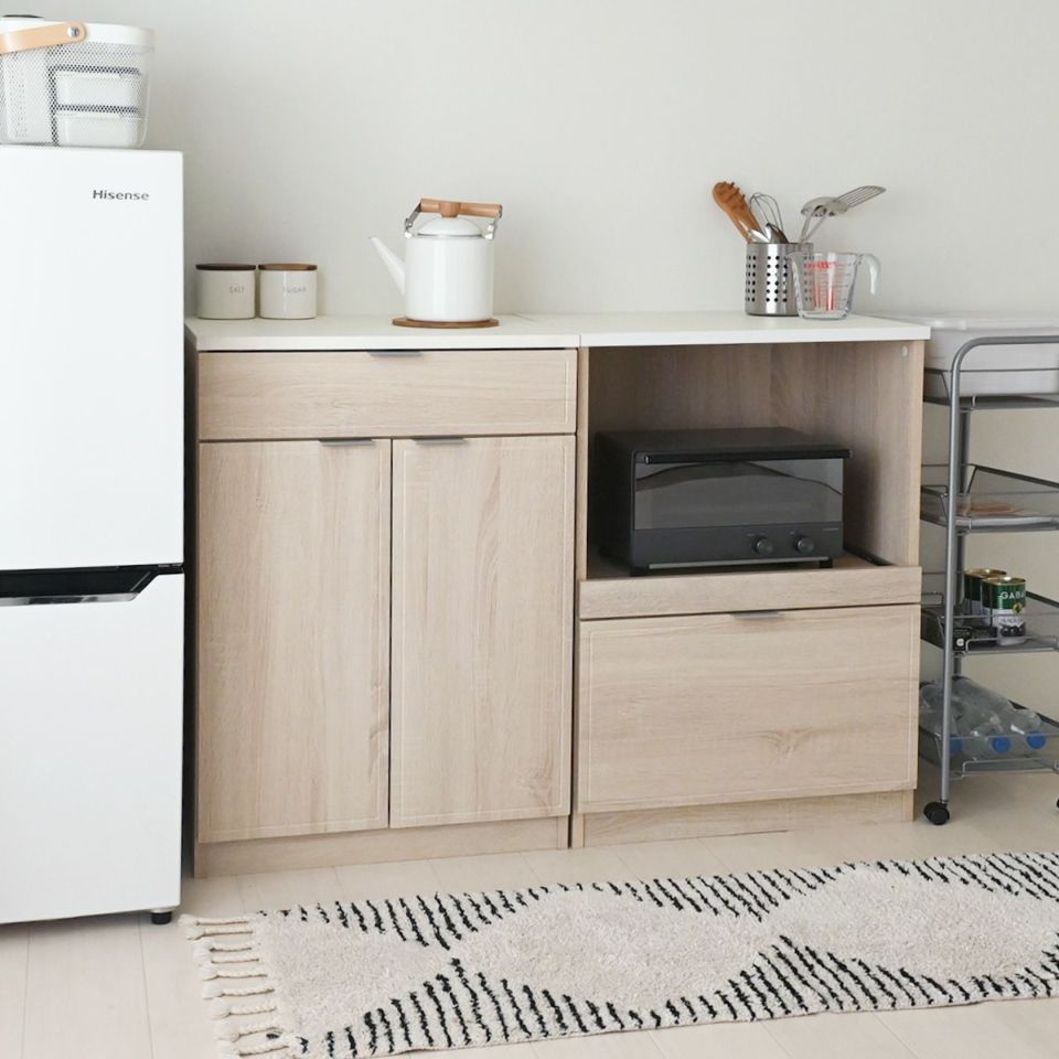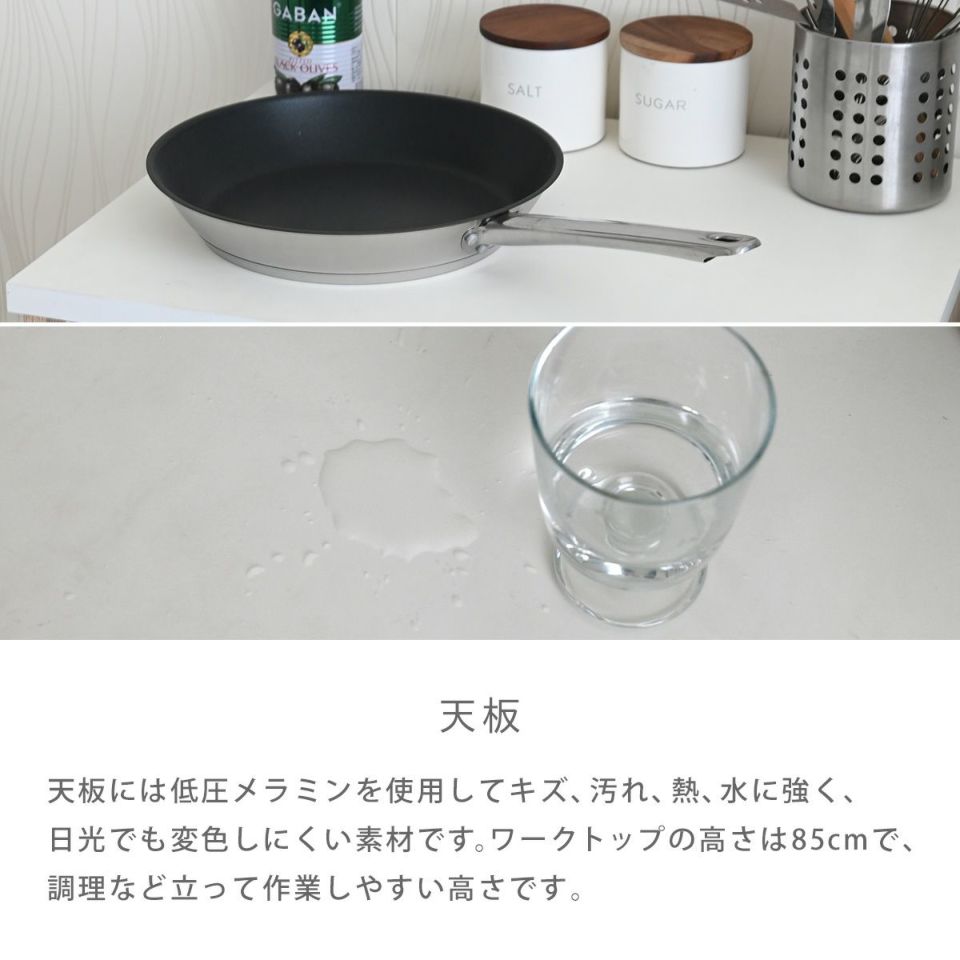 ナチュラルな木目とプレーンなホワイトがアクセント。メラミン天板で傷や汚れにも強いキッチンボード。