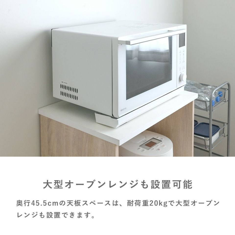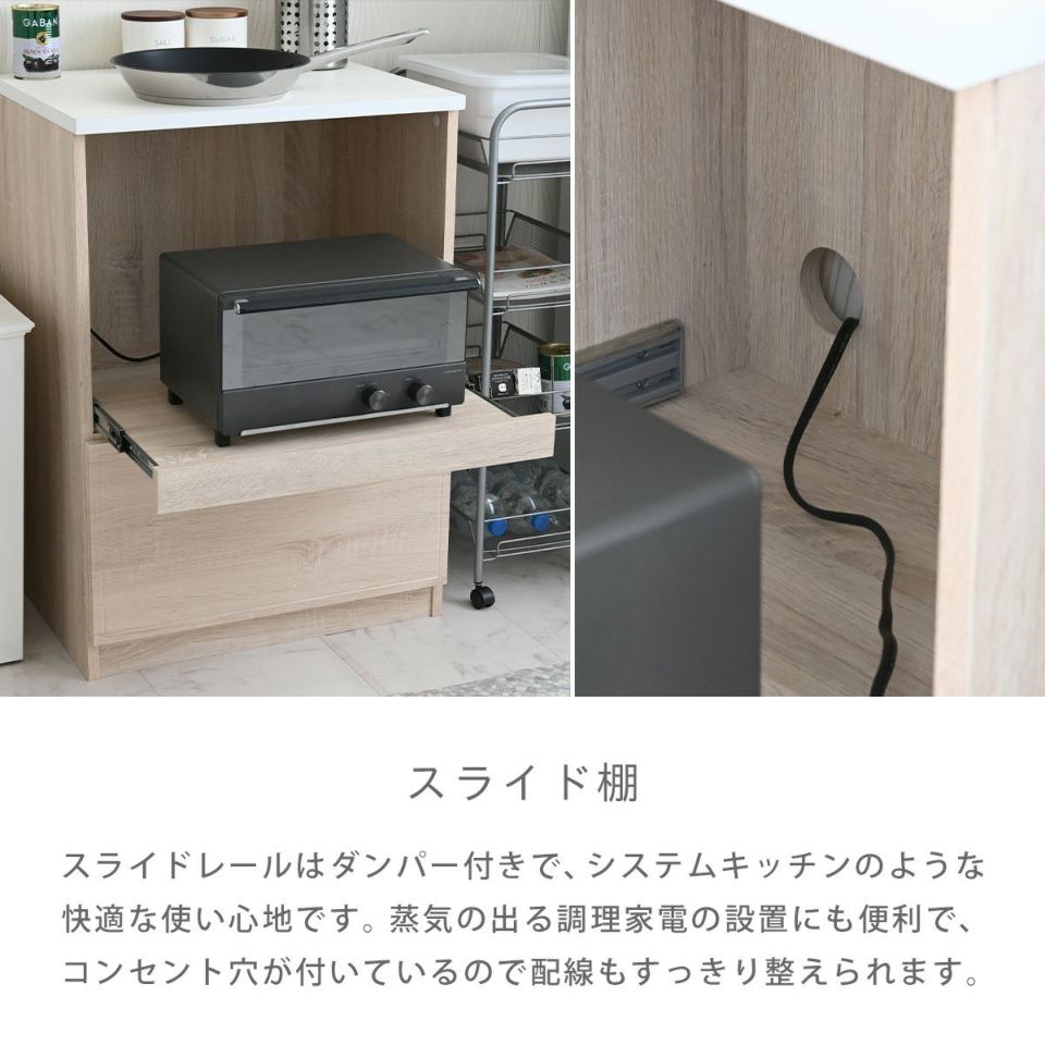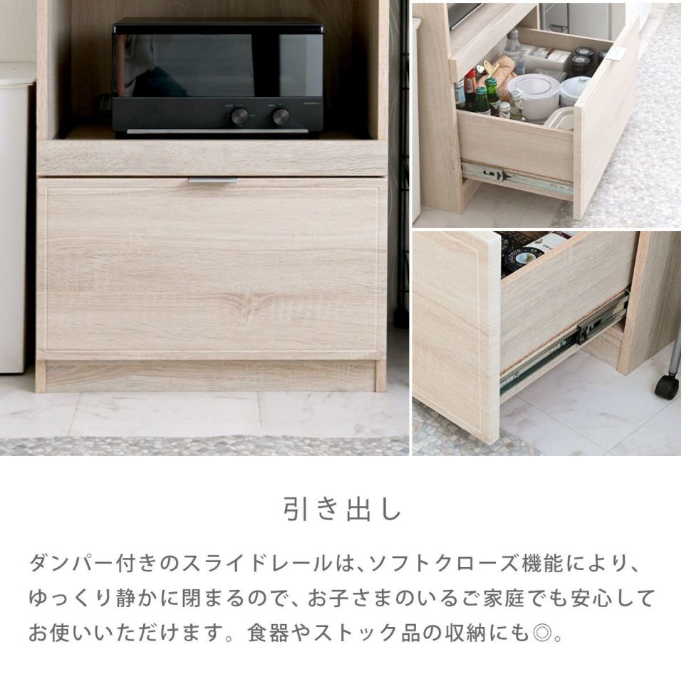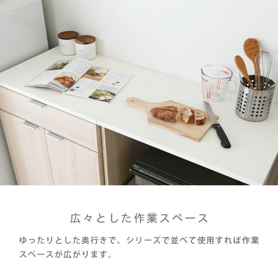 広々とした奥行きがあり、天板は低圧メラミンを使用しているので傷や汚れ、熱にも強く、作業スペースとしても使えるレンジボード。引き出しには、食器やコップはもちろん、鍋やストック品なども収納できるのでごちゃごちゃしがちなキッチンをすっきりと見せることができます。レンジボードは大型レンジや蒸気の出る調理家電も設置可能。シリーズで揃えて使用すれば統一感のあるお部屋を演出することができます。