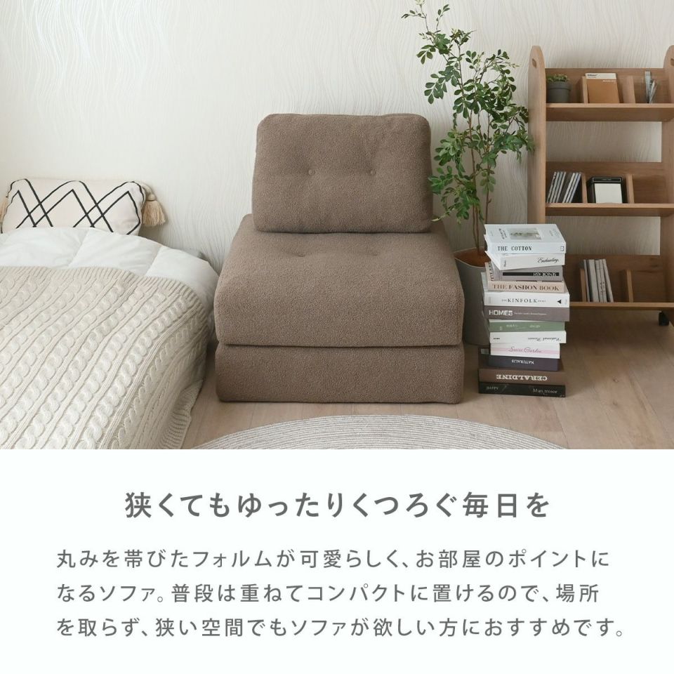 限られたスペースでもゆったりとくつろげる、コンパクトなソファです。丸みを帯びたフォルムが可愛らしく、適度な反発力のある座面がしっかりとした座り心地になっています。重なった座面を横に並べて使用すれば、二人掛けのローソファやソファベッドとしても使うことができ、急な来客時などにも役立ちます。シンプルで落ち着いたデザインが色々なテイストのお部屋にも合わせやすく、様々なシーンで活躍します。