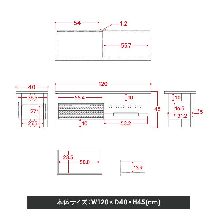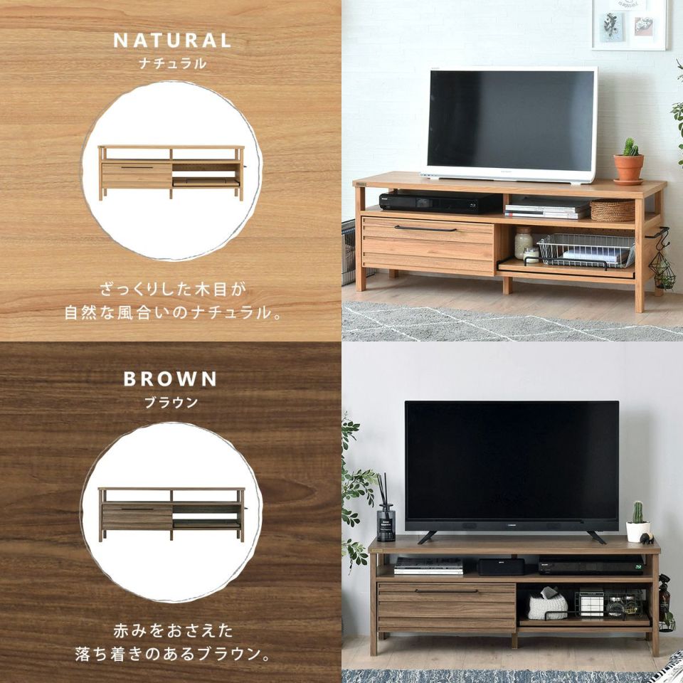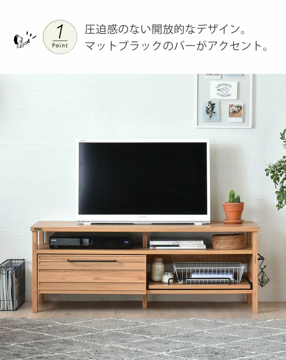 幅120cm、抜け感のある圧迫感のないオープンデザイン。 多彩な収納スペースで使い勝手に合わせて収納できるTVボード。