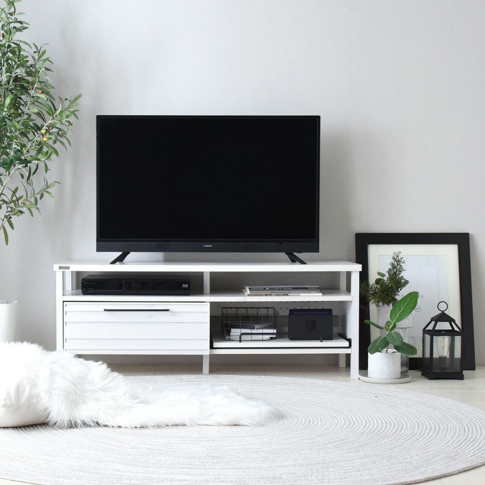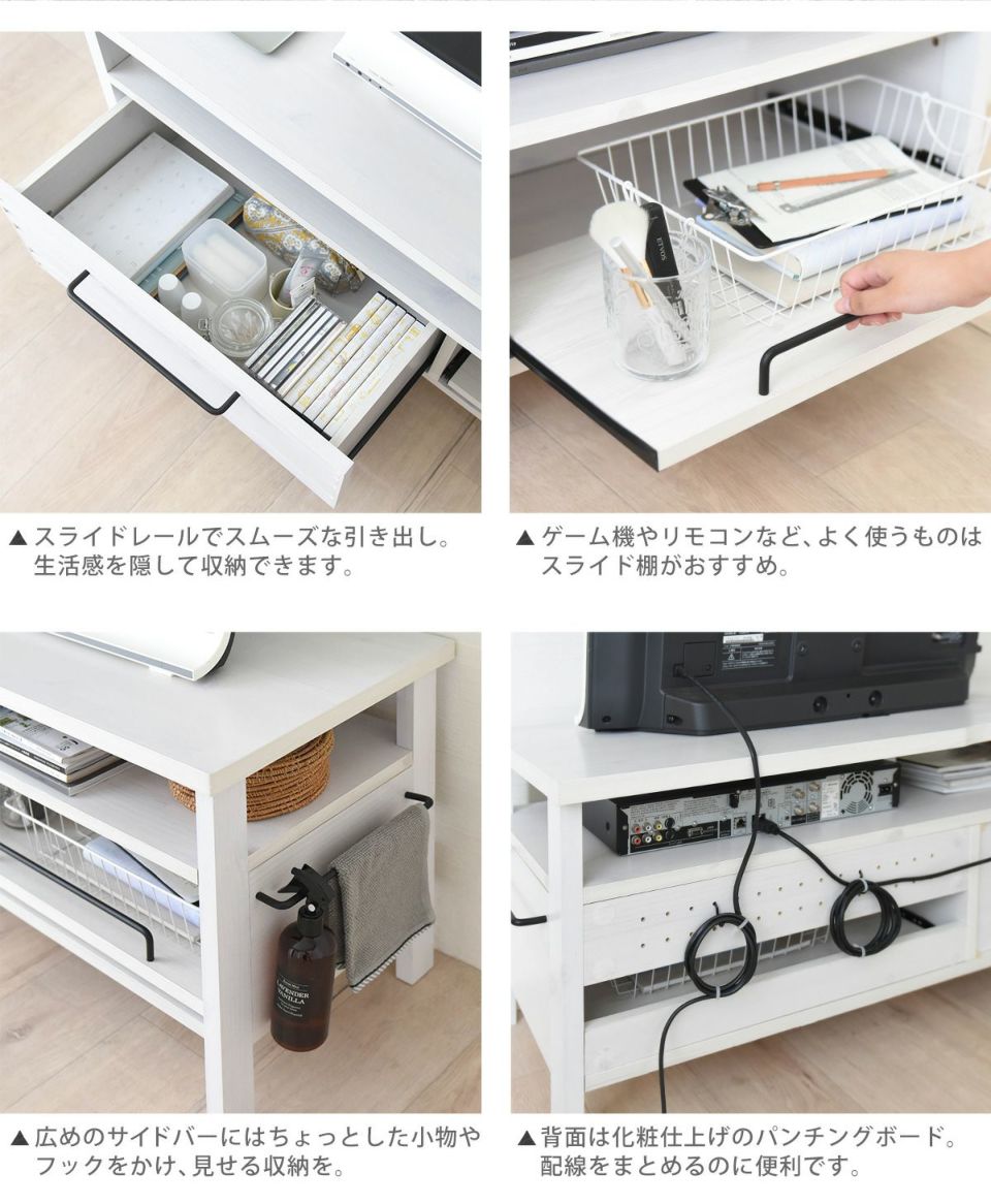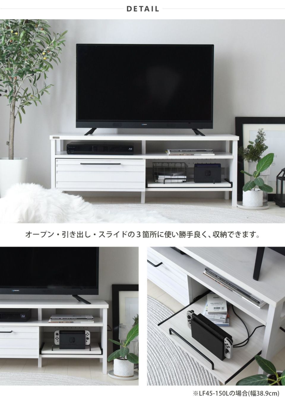 ローボードに引き出しやスライドできる棚がついた、多機能TVボード。ゲーム機やAV機器など、よく手に取るものはスライド棚に置いて、見せながら効率良く。引き出しにはDVDなどを収納。ホワイトインテリアやモノトーンインテリア、北欧インテリア、ナチュラルテイストがお好きな方におすすめ。