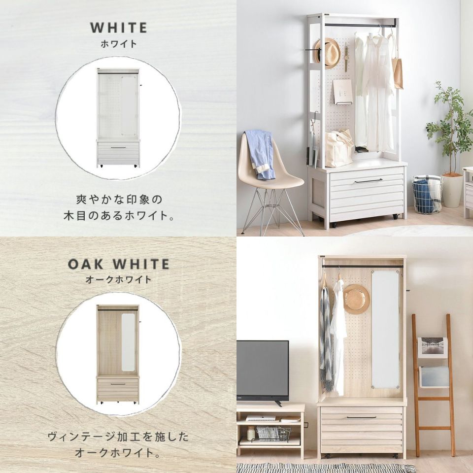 ハンガーラックやパンチングボード、ミラー、キャスター付収納と言った機能性がたくさん詰まった、多機能ハンガーラック。見せながら効率良く収納。お気に入りを有孔ボードでディスプレイできる、見せるクローゼット。ディスプレイとして。ホワイトインテリアや北欧インテリア、ナチュラルテイストがお好きな方におすすめ。