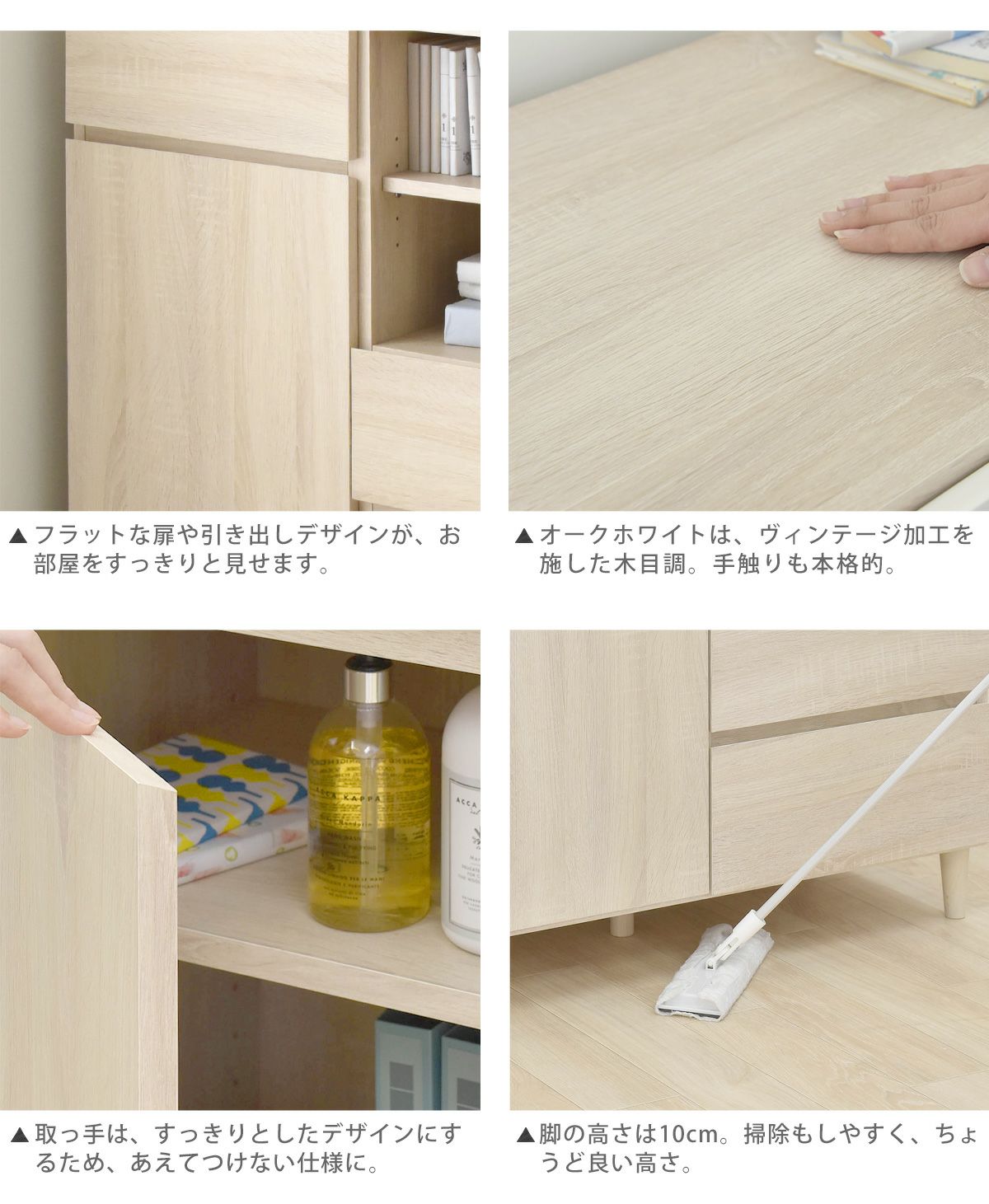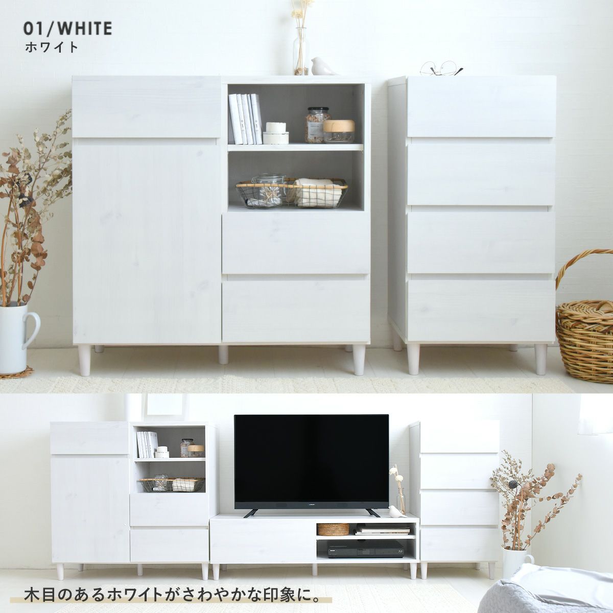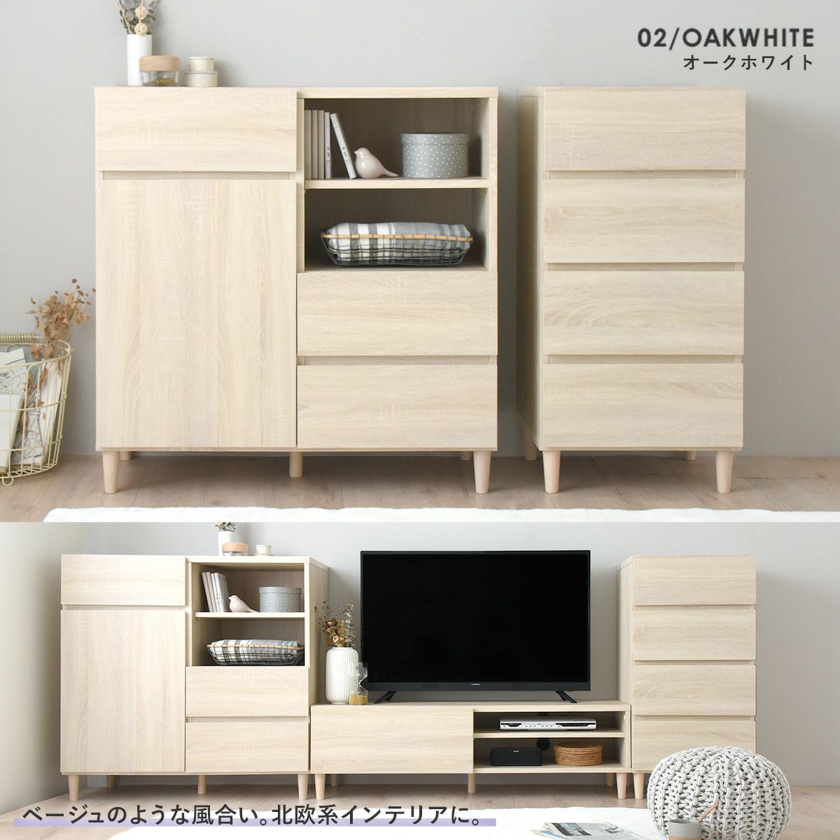 北欧テイストで木目のあるホワイトやヴィンテージ加工のオークホワイトカラーなど、豊富なカラー展開。取っ手のついていない、シンプルデザインがおしゃれ。引き出し、扉、オープン部とたくさんの収納スペースでお部屋もすっきり。北欧テイストやホワイトインテリアが好きな方におすすめ。
