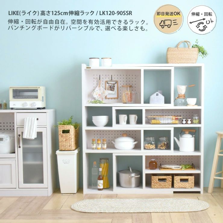 スライドさせて、伸縮・回転できる、オープンラック。 パンチングボードがリバーシブルだから、好きな雰囲気で組み立てて、私らしい、お部屋づくりを。