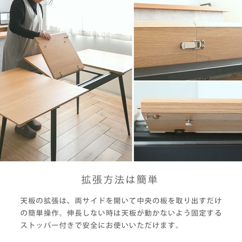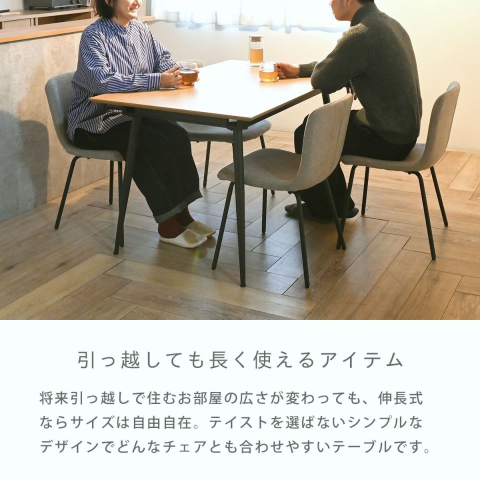すっきりと洗練されたデザインがおしゃれなダイニングテーブルです。伸長式のテーブルとなっており、二人暮らしの方はもちろん、テーブルを拡張すれば6人までお使いいただけます。天板の拡張も簡単にできるので一人でもセッティングがしやすく、天板にはメラミンを使用しているのでお手入れも簡単です。脚部にはアジャスターがついているのでがたつきなく快適にお使いいただくことができ、シンプルなデザインがお部屋になじみます。