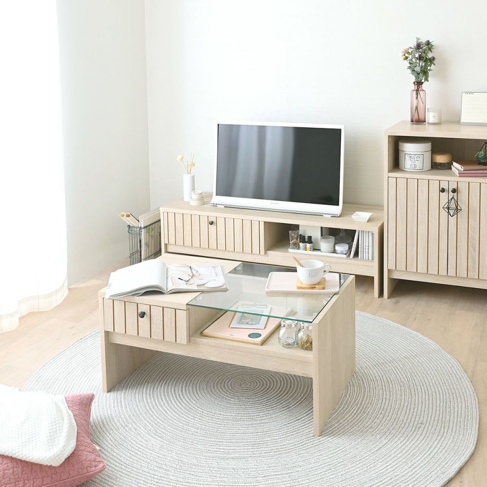 コンパクトな幅80cmの収納付リビングテーブル。ガラス天板の下にお気に入りのコレクションを楽しめます。
