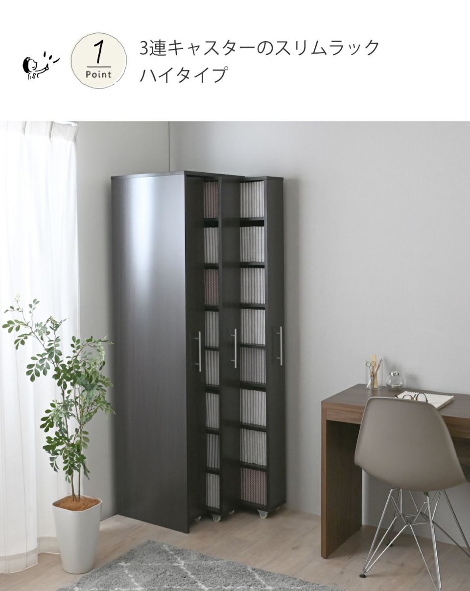 3台のキャスター付きスライド収納庫を出し入れして、隙間を有効活用。省スペースでもタイトルを見やすく収納できます。背表紙を見せないことでお部屋をスタイリッシュに。大切な本を埃や日焼けから守ります。ハイタイプなので上から下までしっかり大容量収納。スムーズな移動を支えるガイド溝とピンがあり、ズレや転倒を防ぎます。移動棚を動かしたり、取っ手の向きを変えたり、収納するものや設置場所に合わせて使いやすく調整できます。