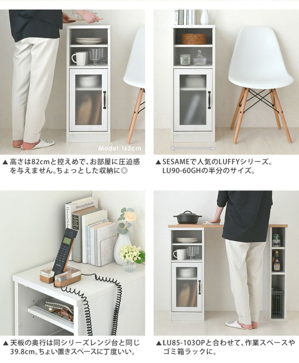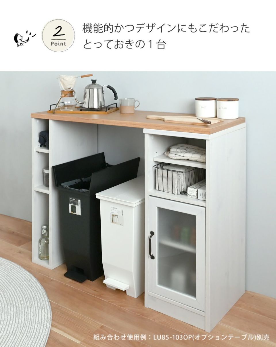 ホワイトの木目調にアンティーク調の取っ手の組み合わせは、北欧や韓国風インテリアのお部屋にぴったり。コンパクトなので一人暮らしのワンルームにもオススメです。LUFFYシリーズのオプションテーブルと合わせてゴミ箱ラックにしてもGood!