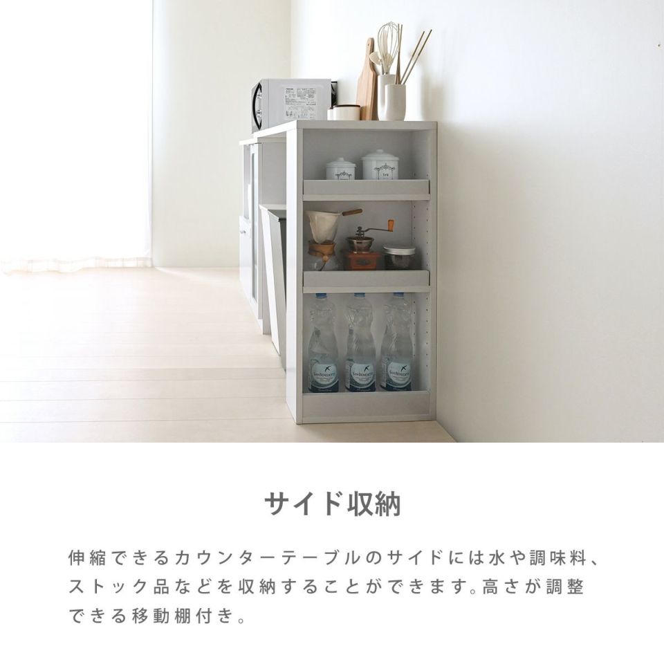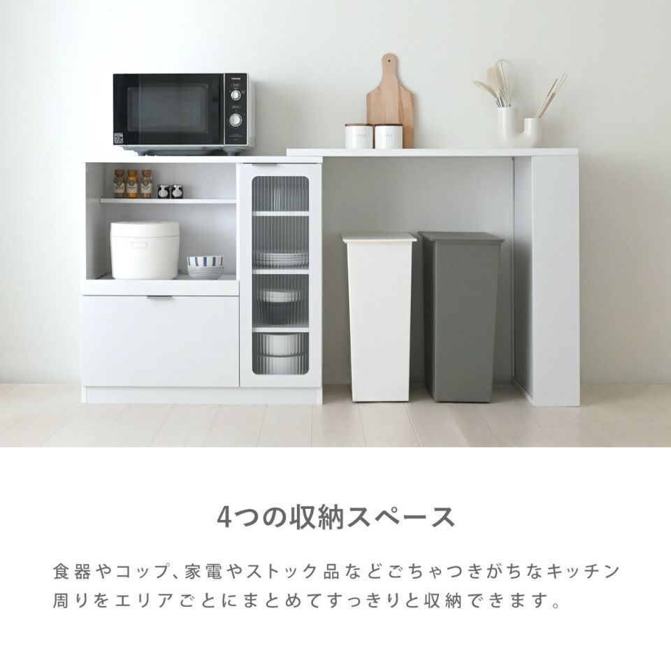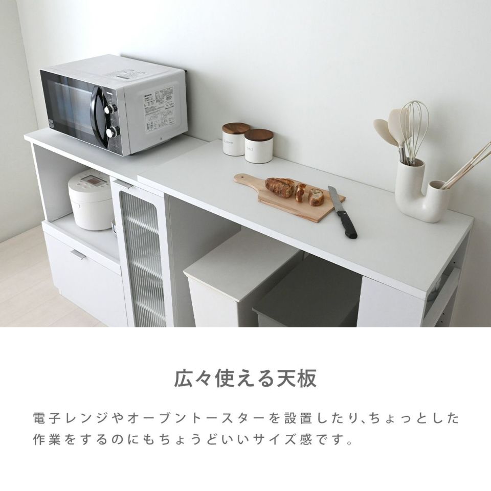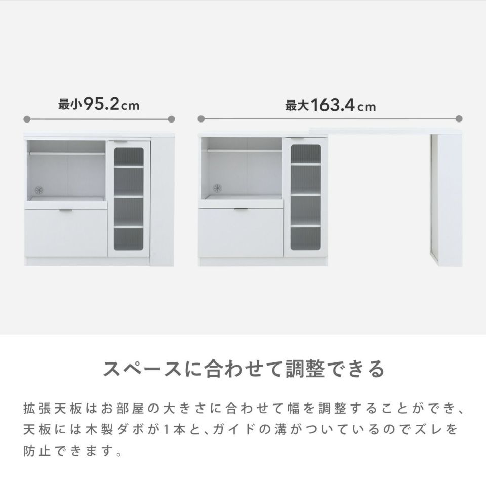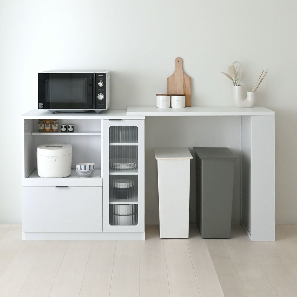 プレーンなホワイトと上品なデザインがおしゃれなレンジボードです。お部屋の大きさに合わせて自由に伸縮することができ、食器はもちろん、鍋やフライパン、ストック品など深さのあるものもまとめて収納できます。拡張天板を最大限まで伸ばして使用すればゴミ箱を設置することも可能で、ごちゃごちゃしがちなキッチン周りをすっきりと見せることができます。コンパクトなサイズ感ながらたくさん収納できるので、一人暮らしのお部屋でも使いやすく、幅広いシーンで活躍するアイテムです。
