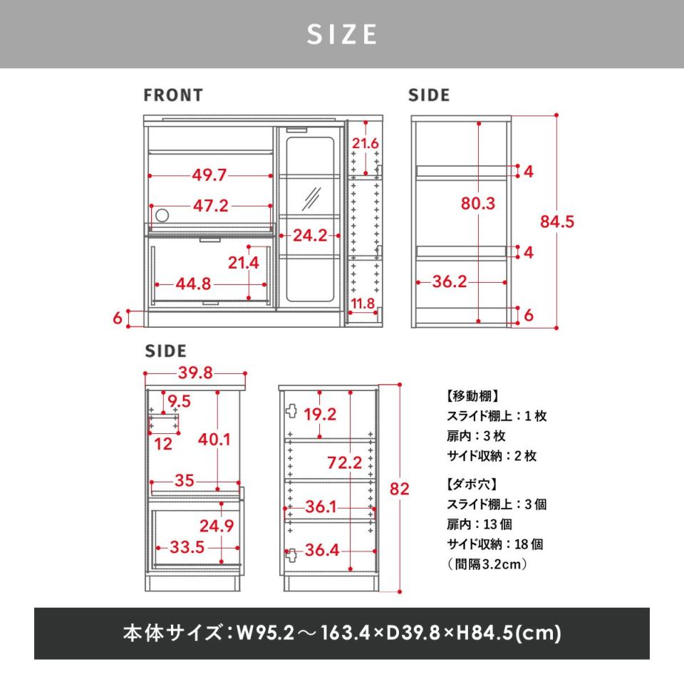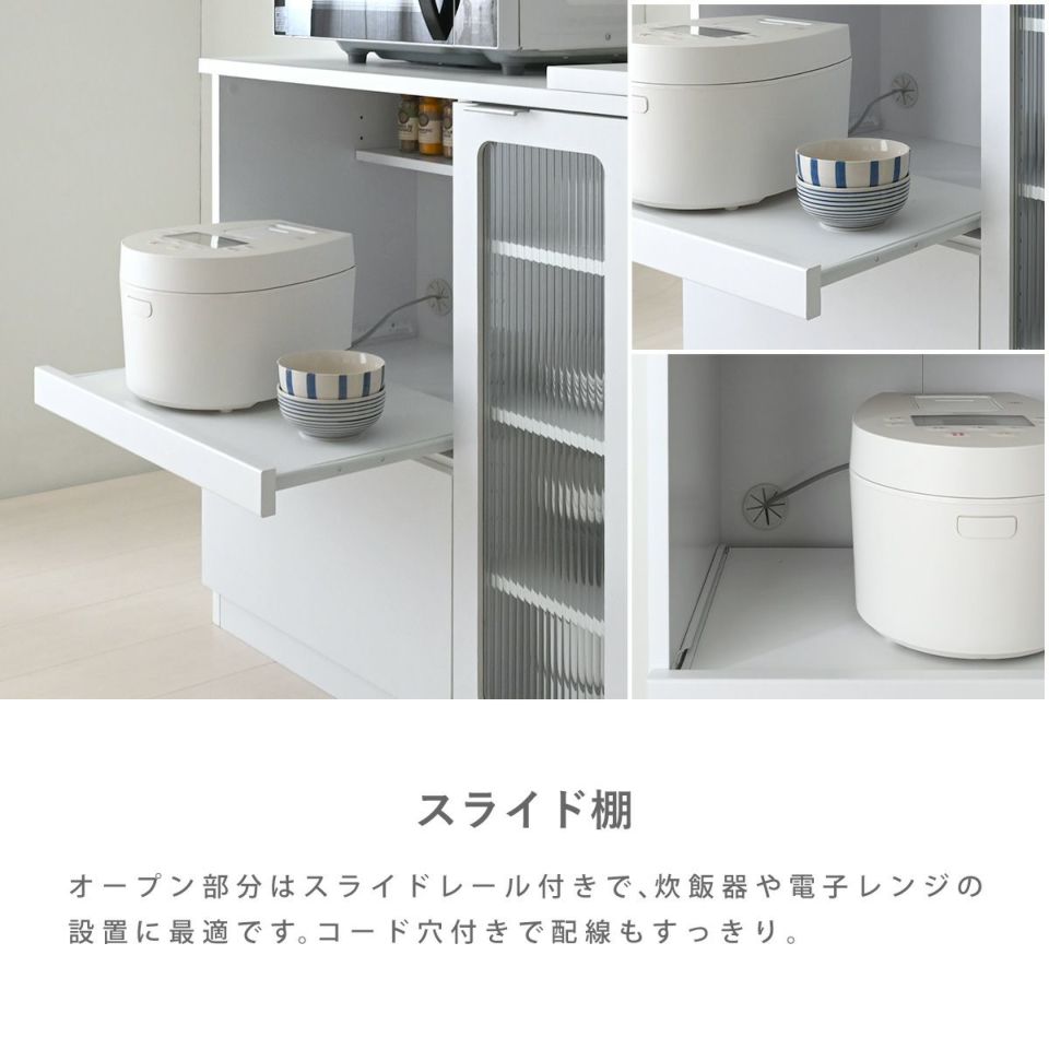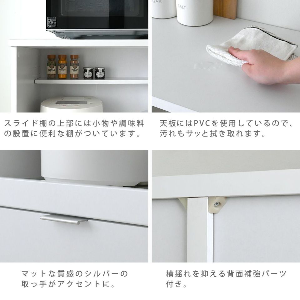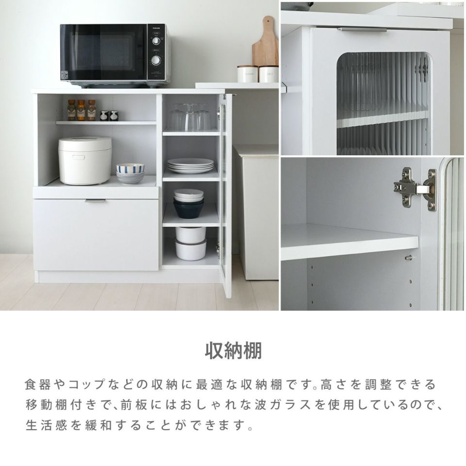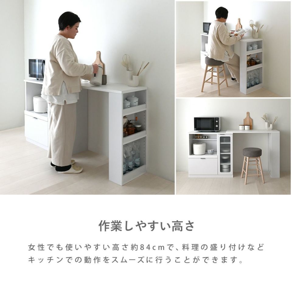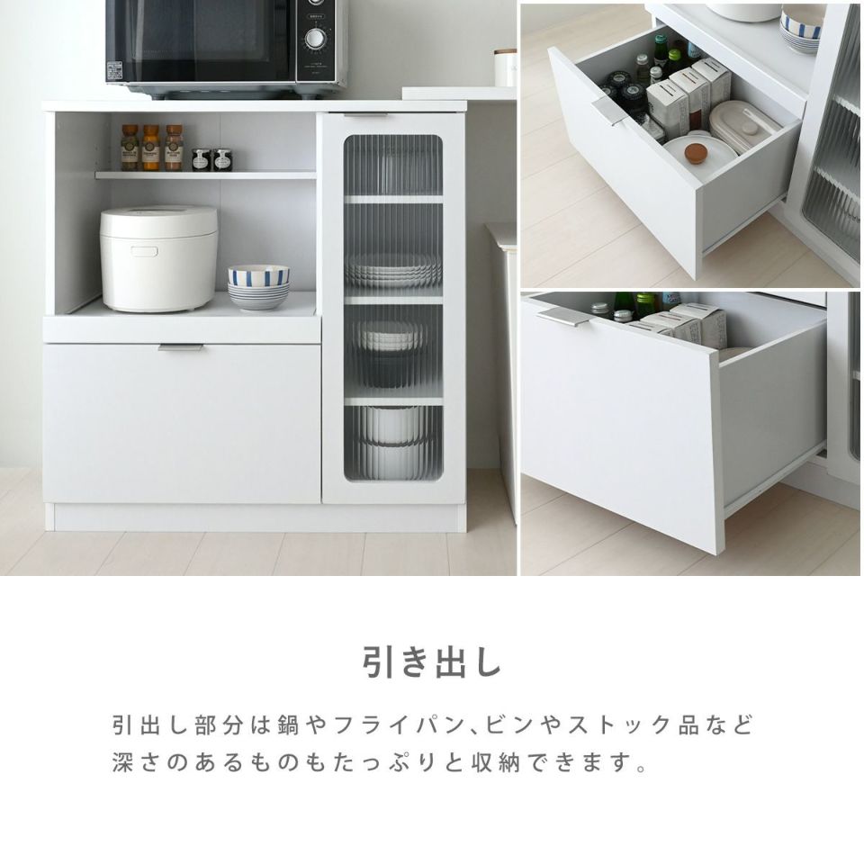 プレーンなホワイトと上品なデザインがおしゃれなレンジボードです。お部屋の大きさに合わせて自由に伸縮することができ、食器はもちろん、鍋やフライパン、ストック品など深さのあるものもまとめて収納できます。拡張天板を最大限まで伸ばして使用すればゴミ箱を設置することも可能で、ごちゃごちゃしがちなキッチン周りをすっきりと見せることができます。コンパクトなサイズ感ながらたくさん収納できるので、一人暮らしのお部屋でも使いやすく、幅広いシーンで活躍するアイテムです。