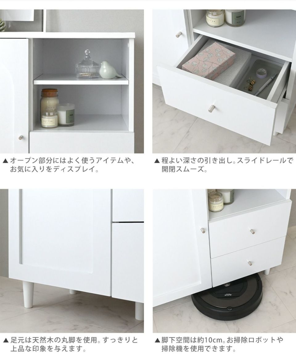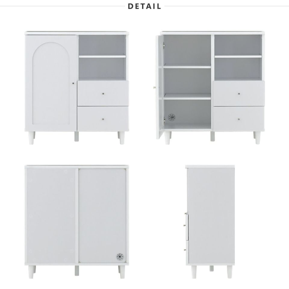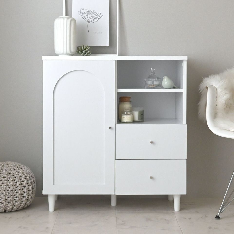 マントルピースのようなデザインの前板とプレーンなホワイトが特徴のキャビネット。曲線と直線のバランスが心地よく、たくさん収納することができます。日用品など生活感のあるものもおしゃれに収納することができ、シンプルなデザインがお部屋になじみます。リビングや寝室など様々なシーンでお使いいただくことが可能で、韓国インテリアがお好きな方にもおすすめのアイテムです。