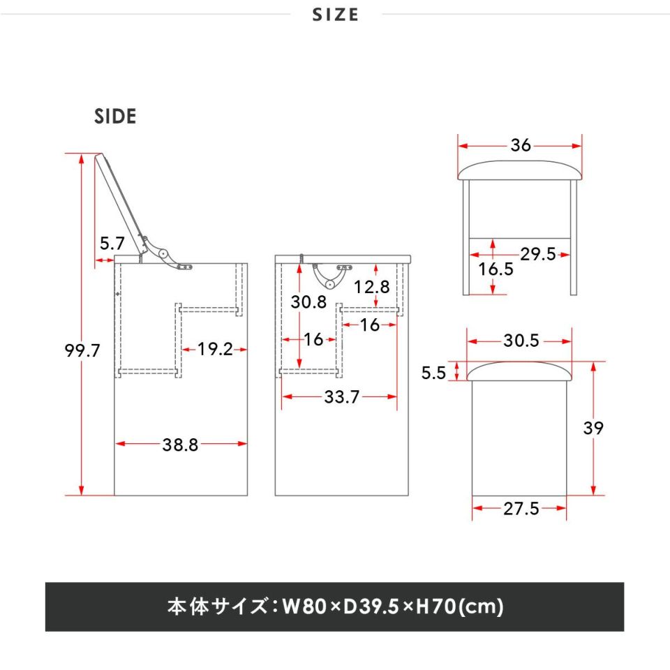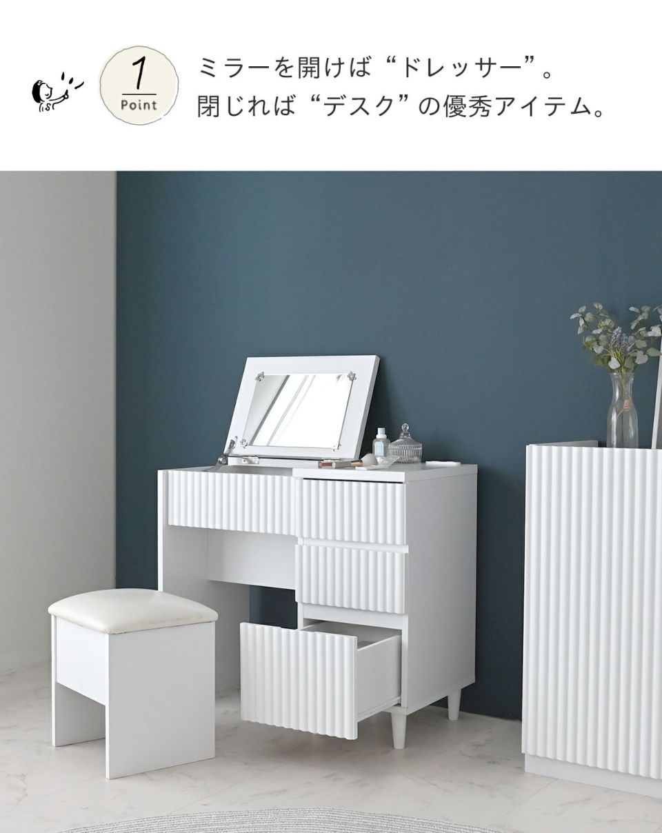 取っ手のついていない、シンプルデザインがおしゃれなデスクドレッサーです。ごちゃっとしがちなメイク道具やヘアアイロンなどもすっきりと収納することができ、お部屋の生活感を隠すことができます。ミラーを閉じればデスクとしても使うことができ、様々なシーンに応じてマルチにお使いいただけるアイテムです。