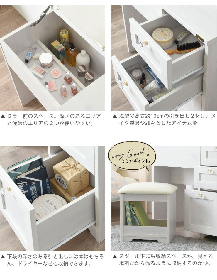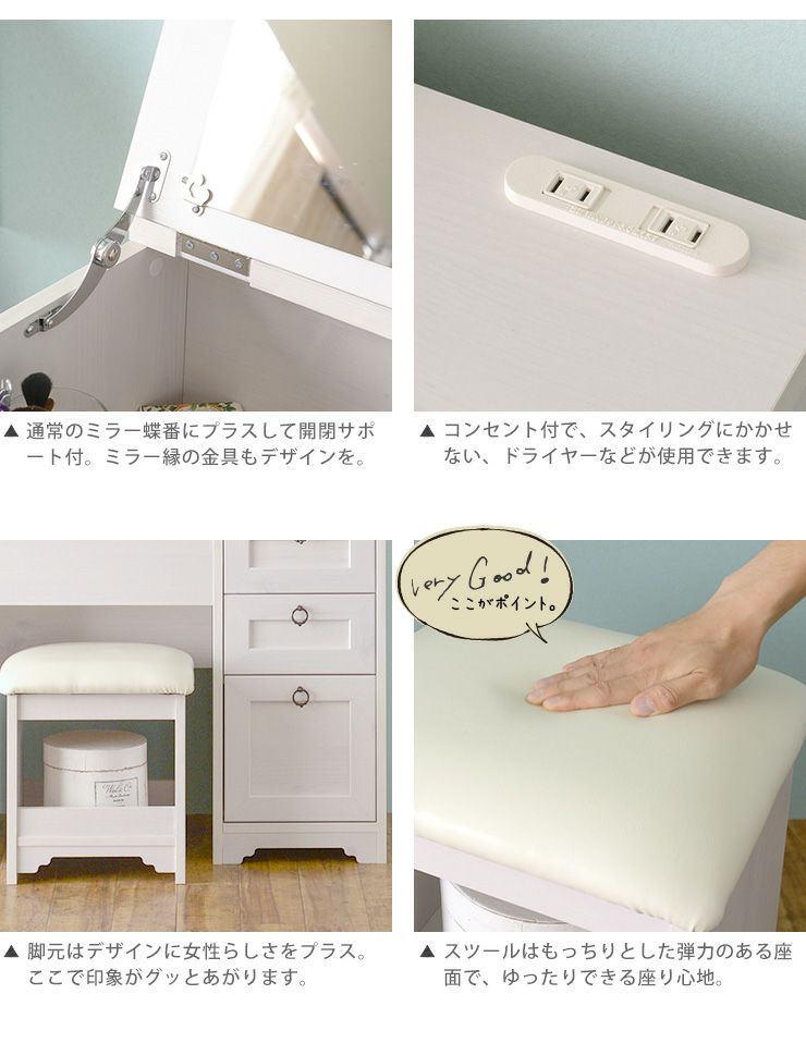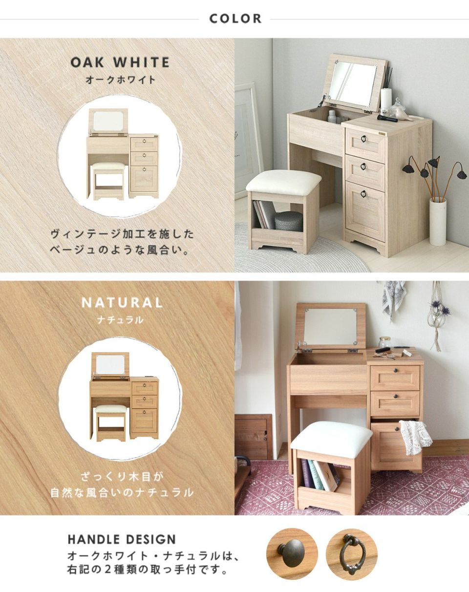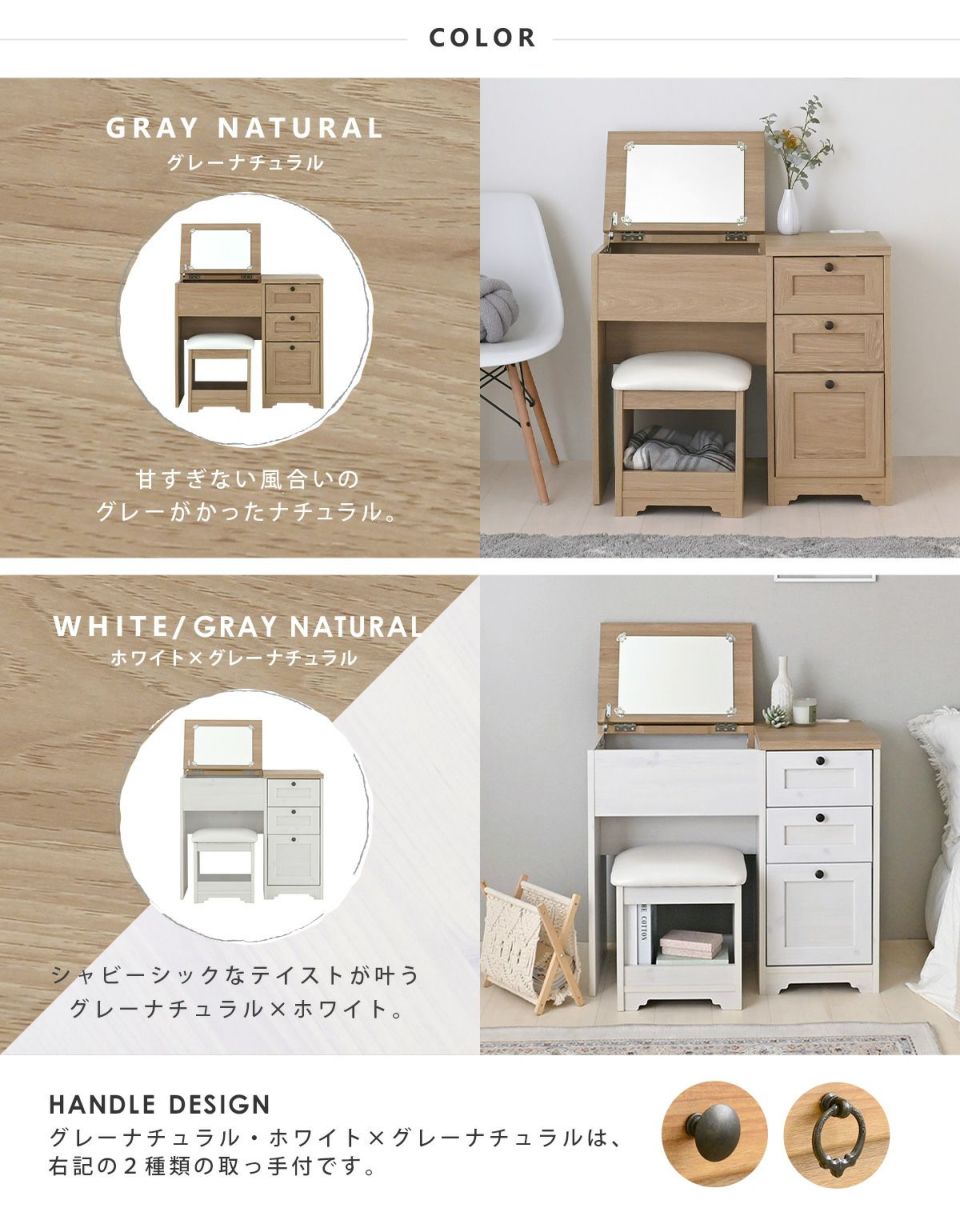 ミラーを閉じれば、デスク。開けると収納たっぷりのドレッサー。 取っ手も2種類付で、選べて、楽しめる。