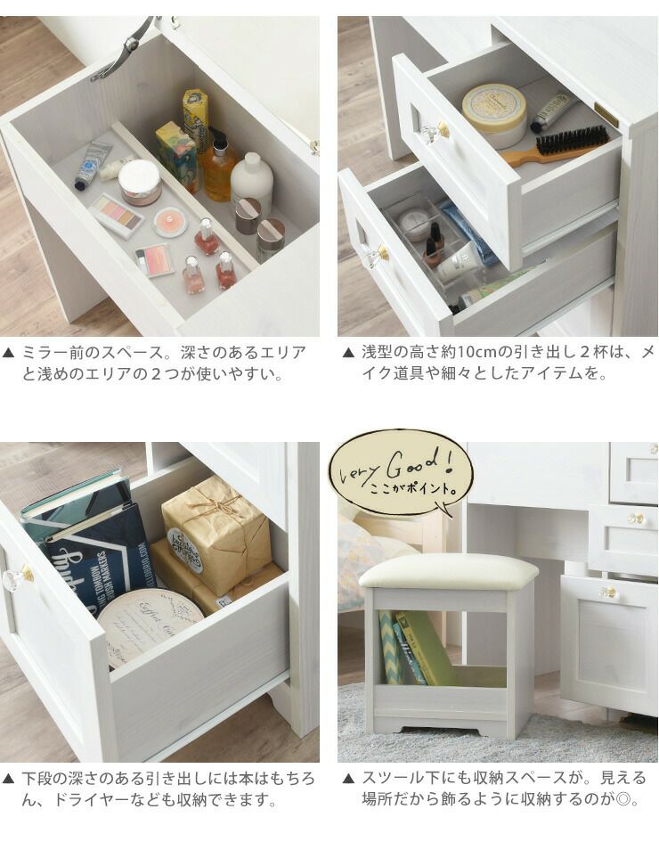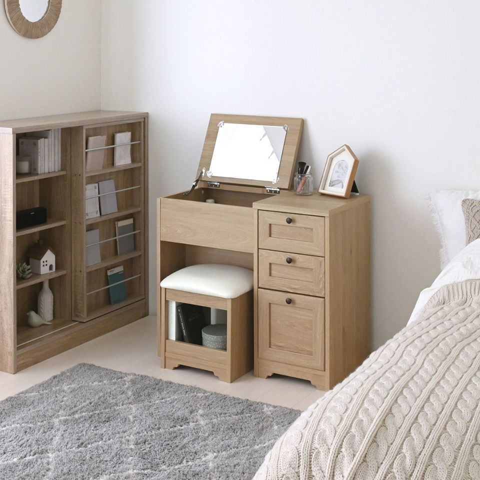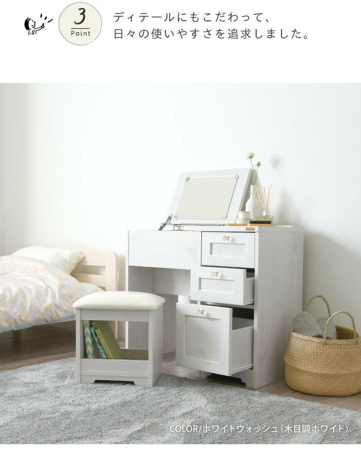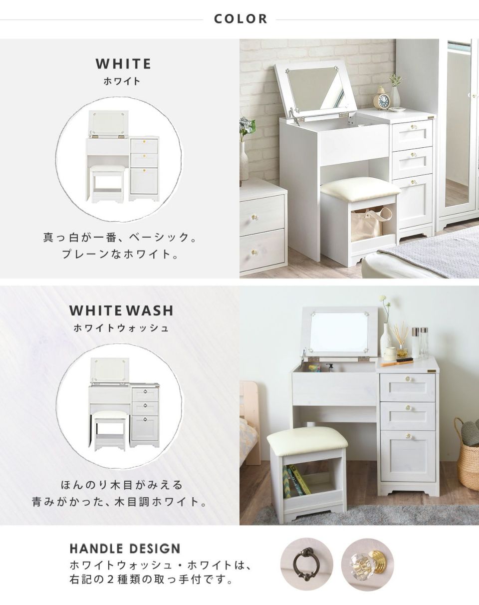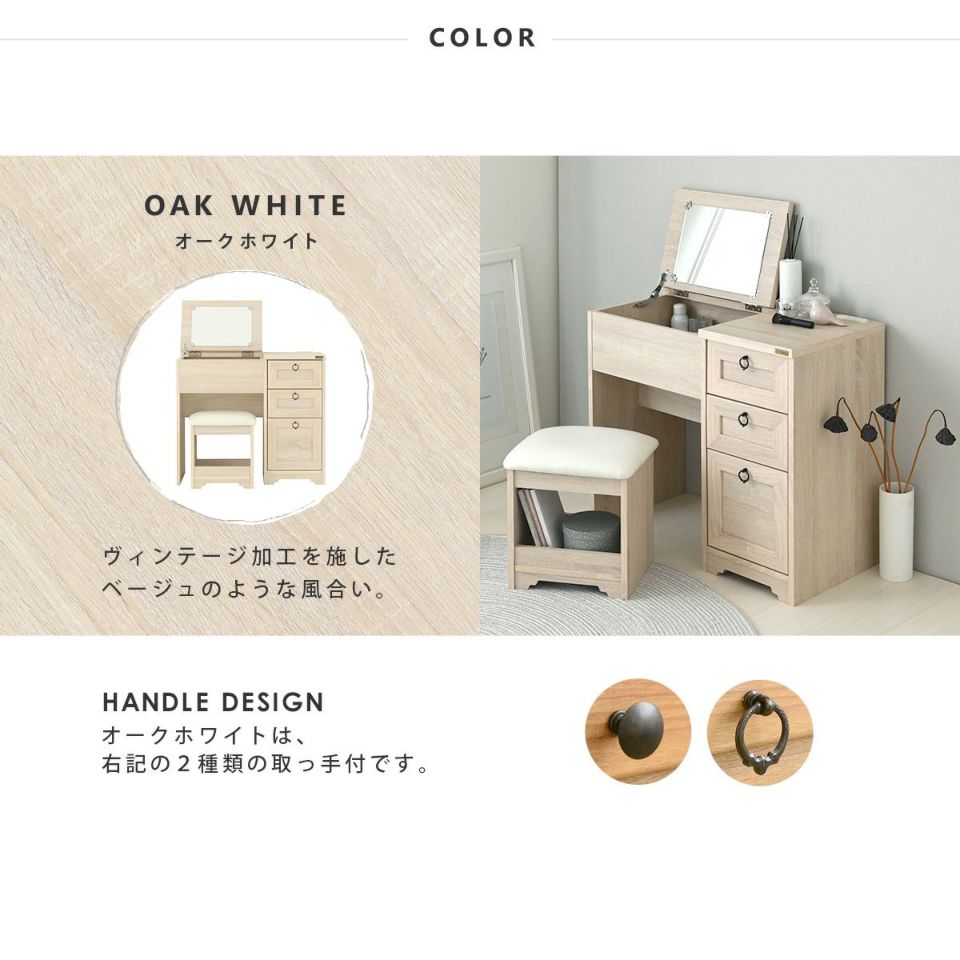 SESAMEロングセラーの、コンパクトタイプの取っ手2種類付で選べるデスクドレッサーに完成品が登場。 クッション性の高いスツール付で、届いたその日から快適に使えて、便利。 真っ白なホワイトや、「うっすら木目がみえる」ホワイトウォッシュ、ヴィンテージ加工のオークホワイトなど、韓国インテリアにぴったりのカラー展開。