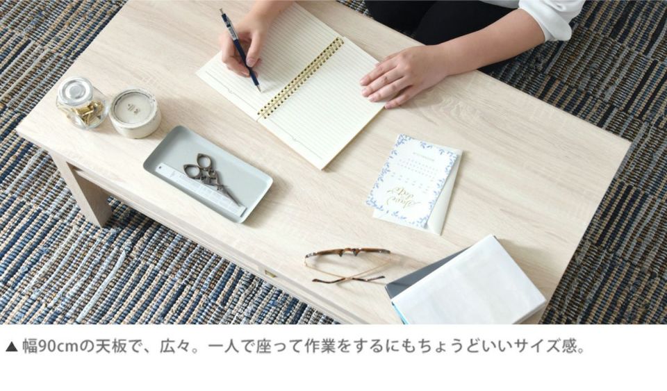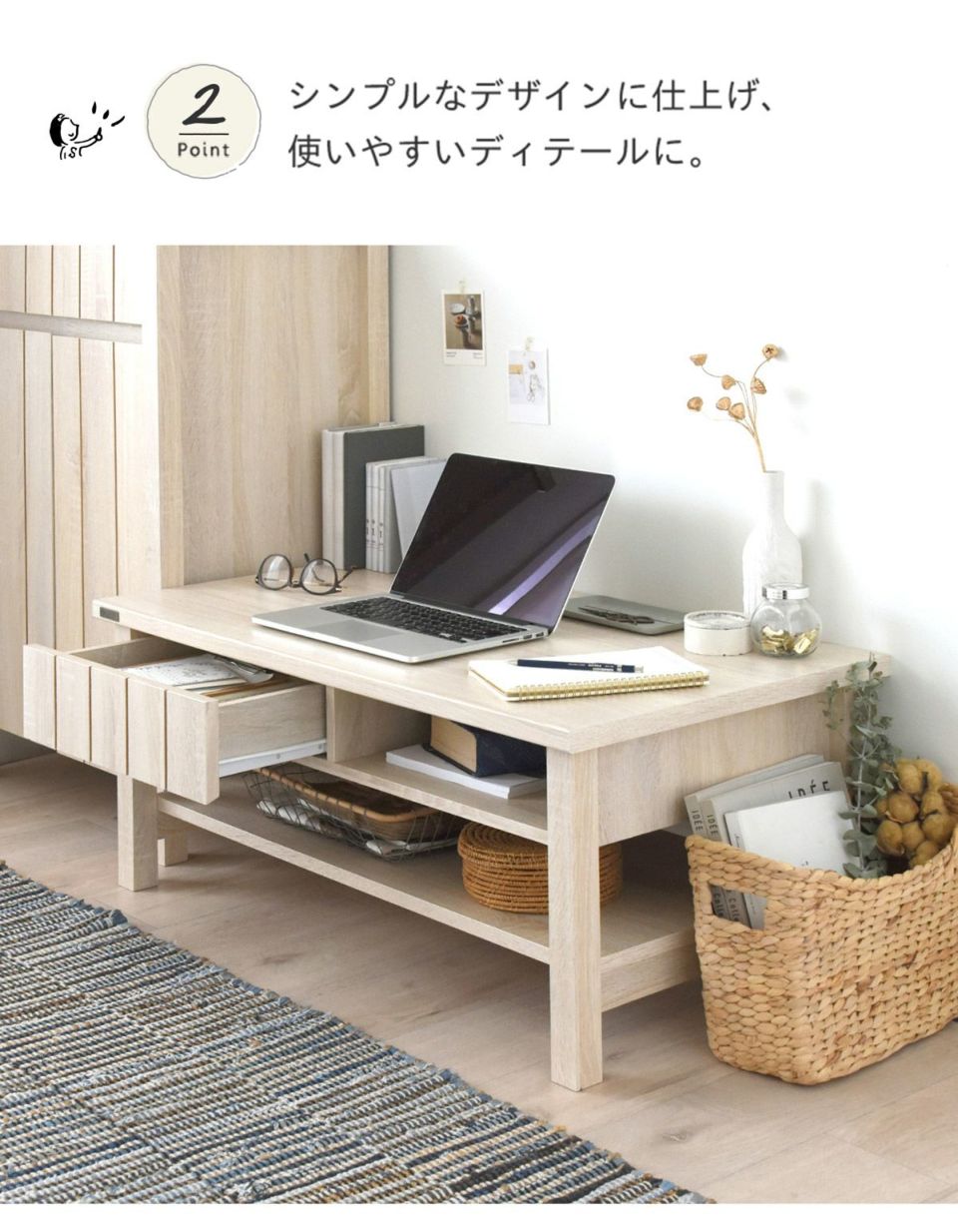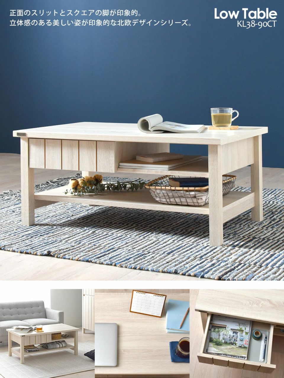 幅90cmとコンパクトでも収納力のあるセンターテーブル。引き出し、棚、オープン部分とたくさんの収納付き。ワンルームのお部屋にもちょうどいいサイズ感。シュッとした角脚が、シンプルなお部屋にもぴったりです。北欧テイストやホワイトインテリアが好きな方におすすめ。