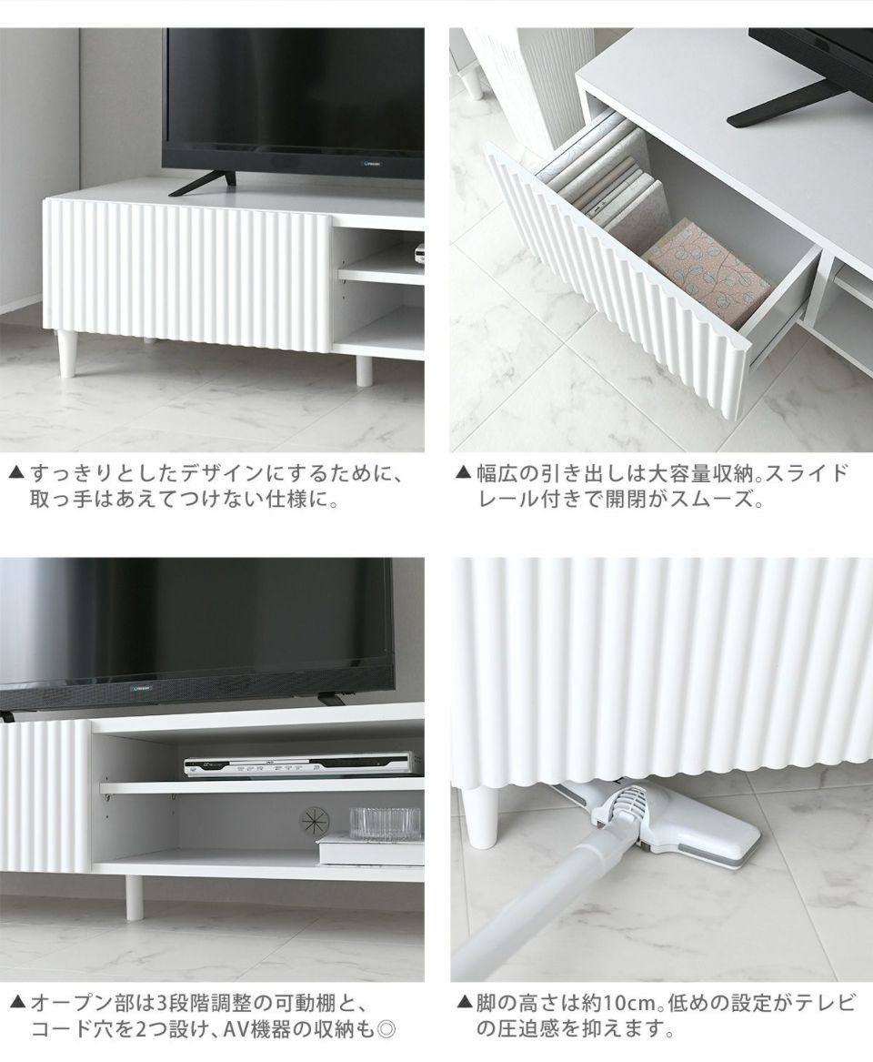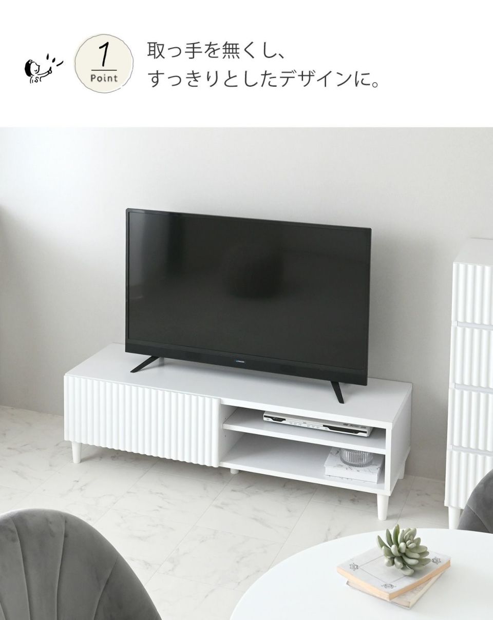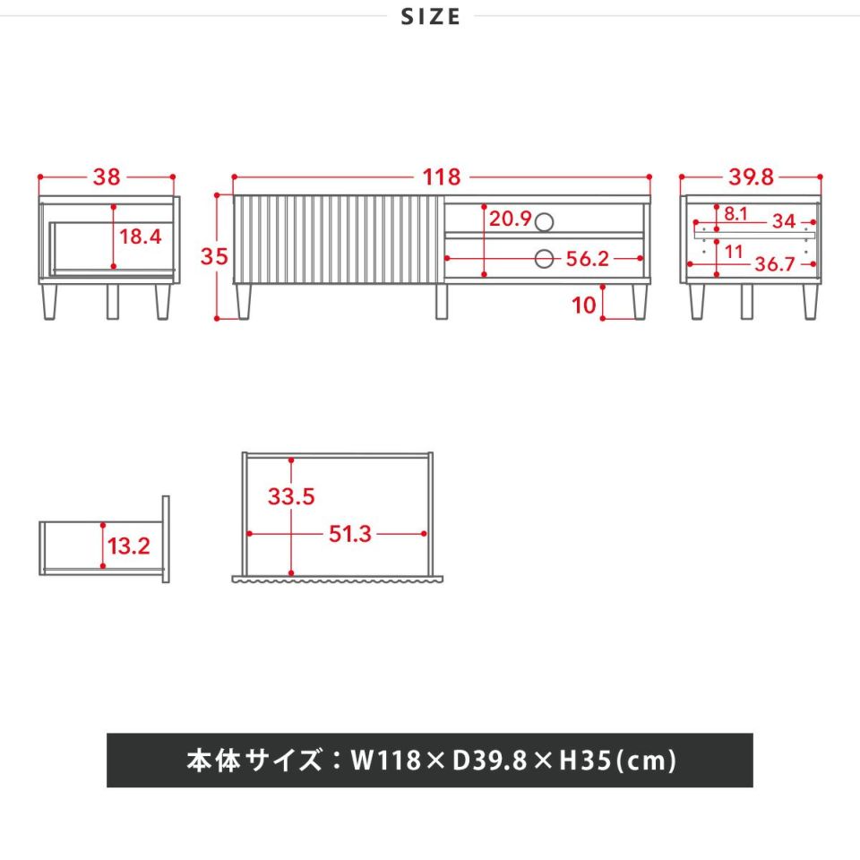 幅は約120cmで、高さが約35cmと低いロータイプは圧迫感が少なく、お部屋を広く見せてくれます。ゲーム機などが置けるオープン棚にはコード穴が二つあり、コードを逃して使用できます。DVDやA4サイズの紙類などを隠して収納できる引き出しはスライドレール付きで開閉がスムーズです。40V型までのテレビに対応。リビングがすっきり片付くテレビ台です。