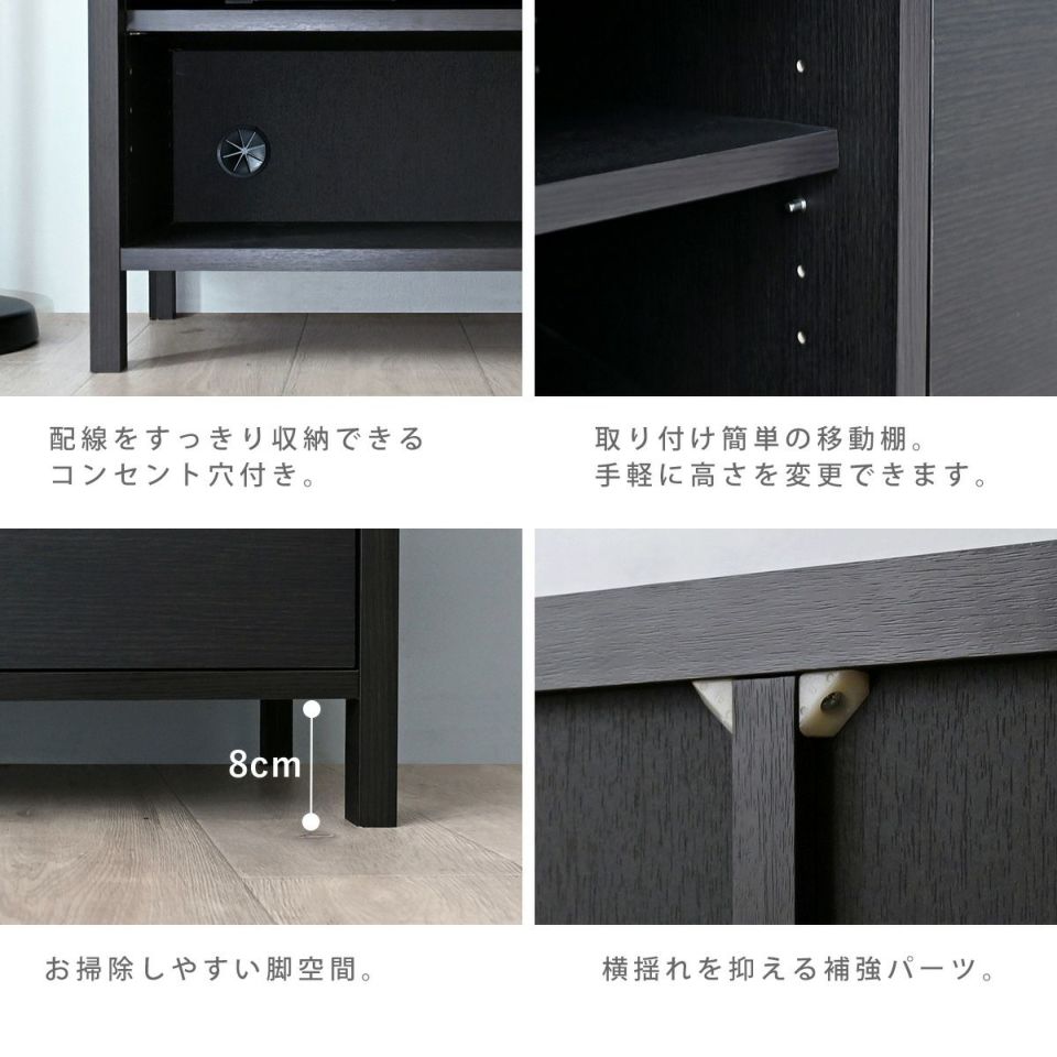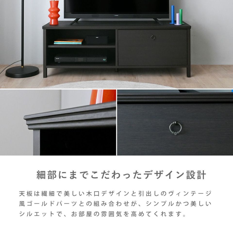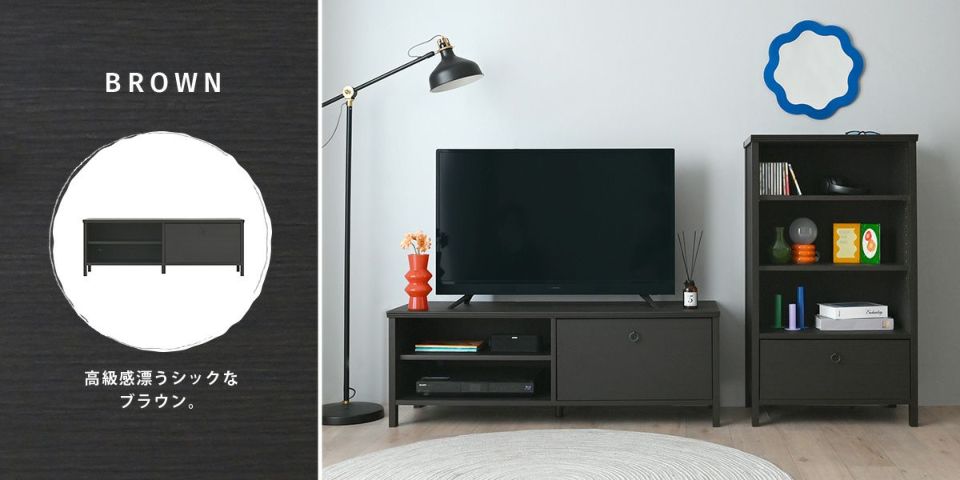 レトロな雰囲気とタイムレスなデザインがおしゃれなテレビ台です。天板には、細部にまでこだわった美しい木口のデザインが施されており、ヴィンテージ風の取っ手との相性も抜群です。オープン部分には、様々なサイズのAV機器や大型のゲーム機器を収納することができ、引き出し部分には、生活感のあるものもまとめて収納できるため、リビングをすっきりと見せることができます。シリーズで揃えて使用すればお部屋に統一感を持たせることができ、落ち着いた雰囲気の空間を演出できます。