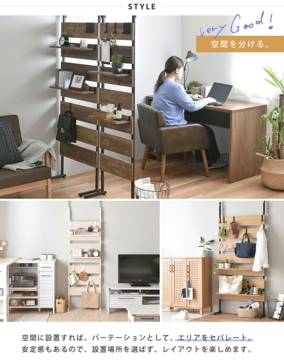 ウォールシェルフに取り付けできる、専用のオプション棚。高さや位置を自由に変えられるのが嬉しい。別売のウォールシェルフは、つっぱりタイプなので、設置場所も選ばず、壁も傷つけません。サイズも選べるので、ワンルームや一人暮らしはもちろん、玄関や洗面台など、スペースのない場所でも設置できます。ウォールシェルフ本体は60,80cmどちらでも取り付け可能です。