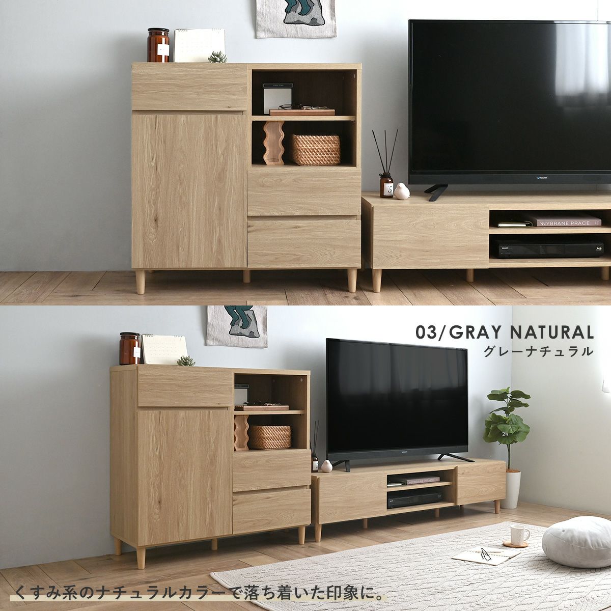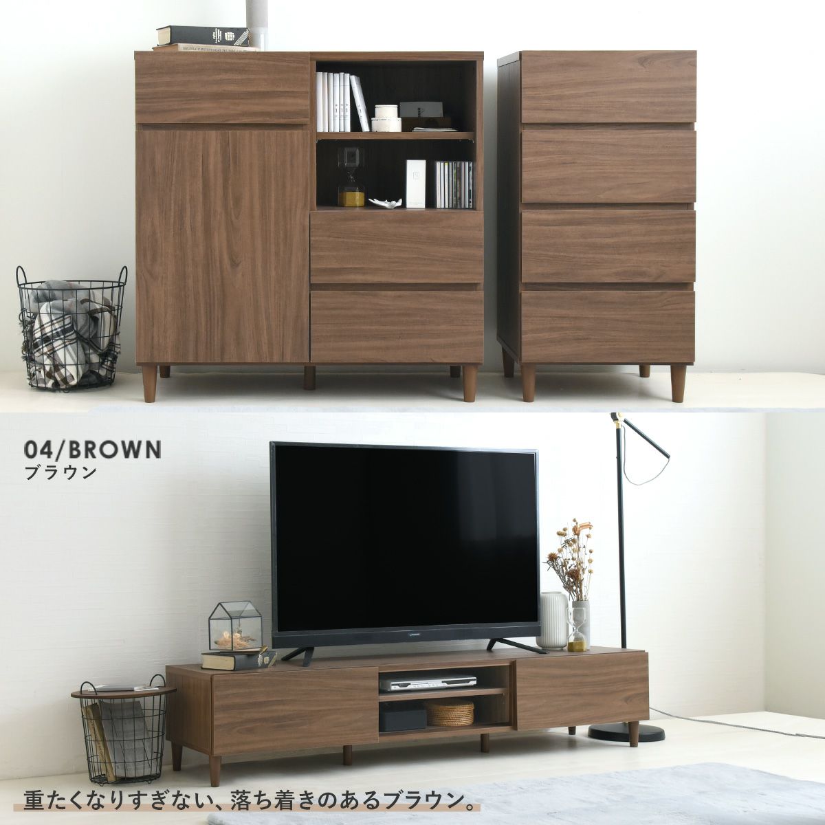 北欧テイストで木目のあるホワイトやヴィンテージ加工のオークホワイトカラーなど、豊富なカラー展開。取っ手のついていない、シンプルデザインがおしゃれ。引き出し、扉、オープン部とたくさんの収納スペースでお部屋もすっきり。北欧テイストやホワイトインテリアが好きな方におすすめ。