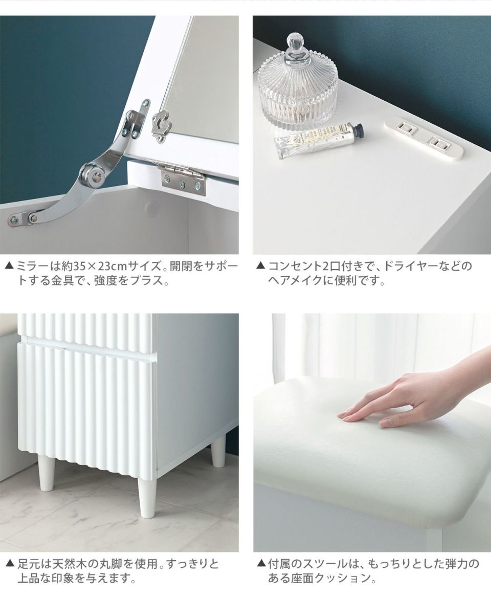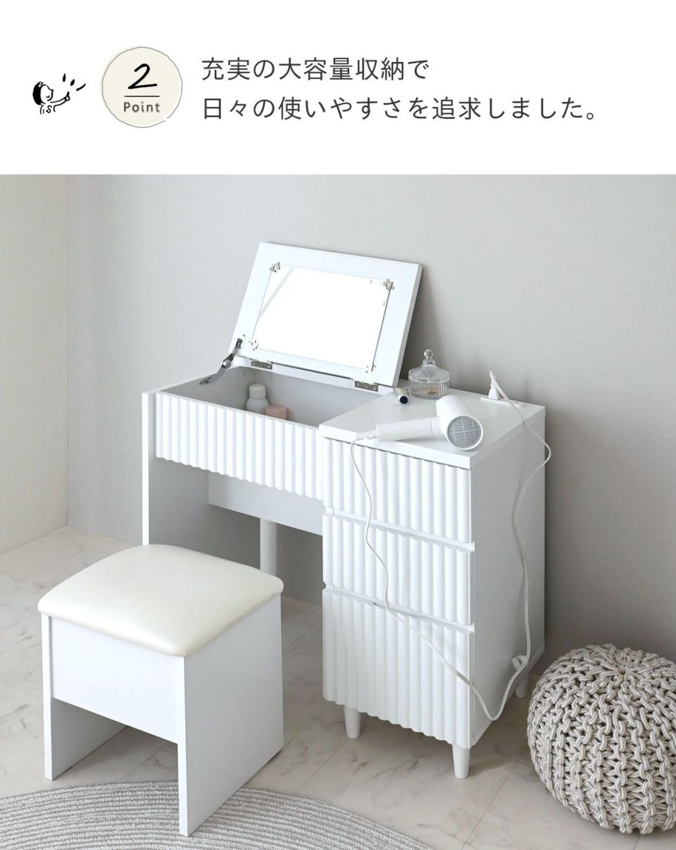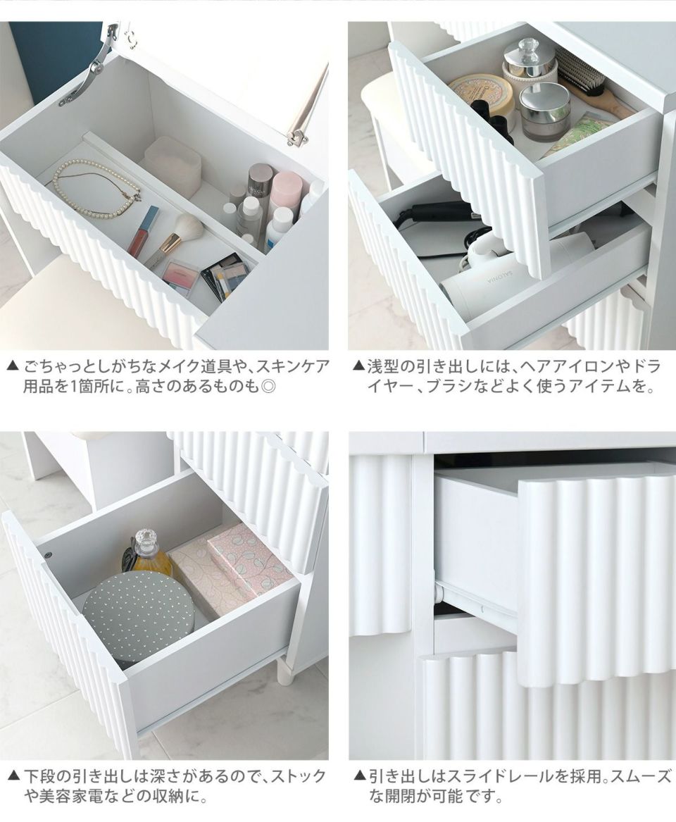 取っ手のついていない、シンプルデザインがおしゃれなデスクドレッサーです。ごちゃっとしがちなメイク道具やヘアアイロンなどもすっきりと収納することができ、お部屋の生活感を隠すことができます。ミラーを閉じればデスクとしても使うことができ、様々なシーンに応じてマルチにお使いいただけるアイテムです。