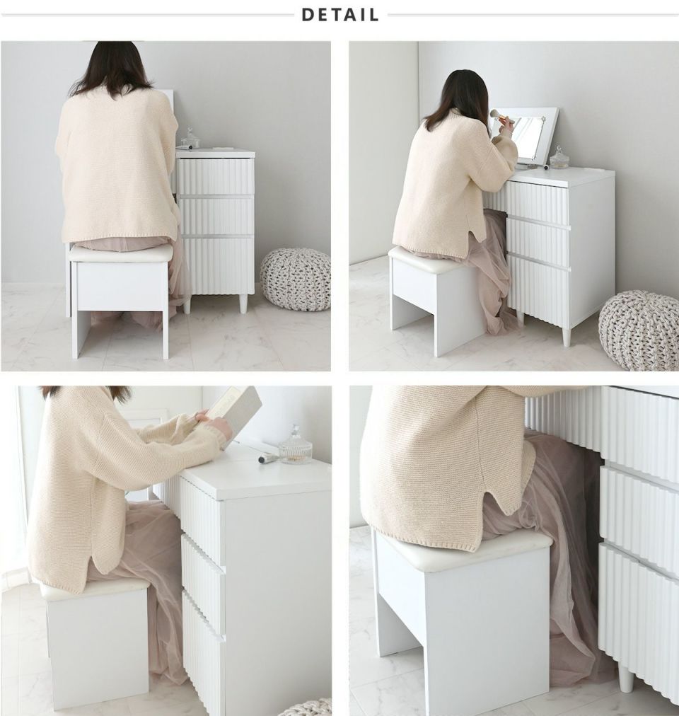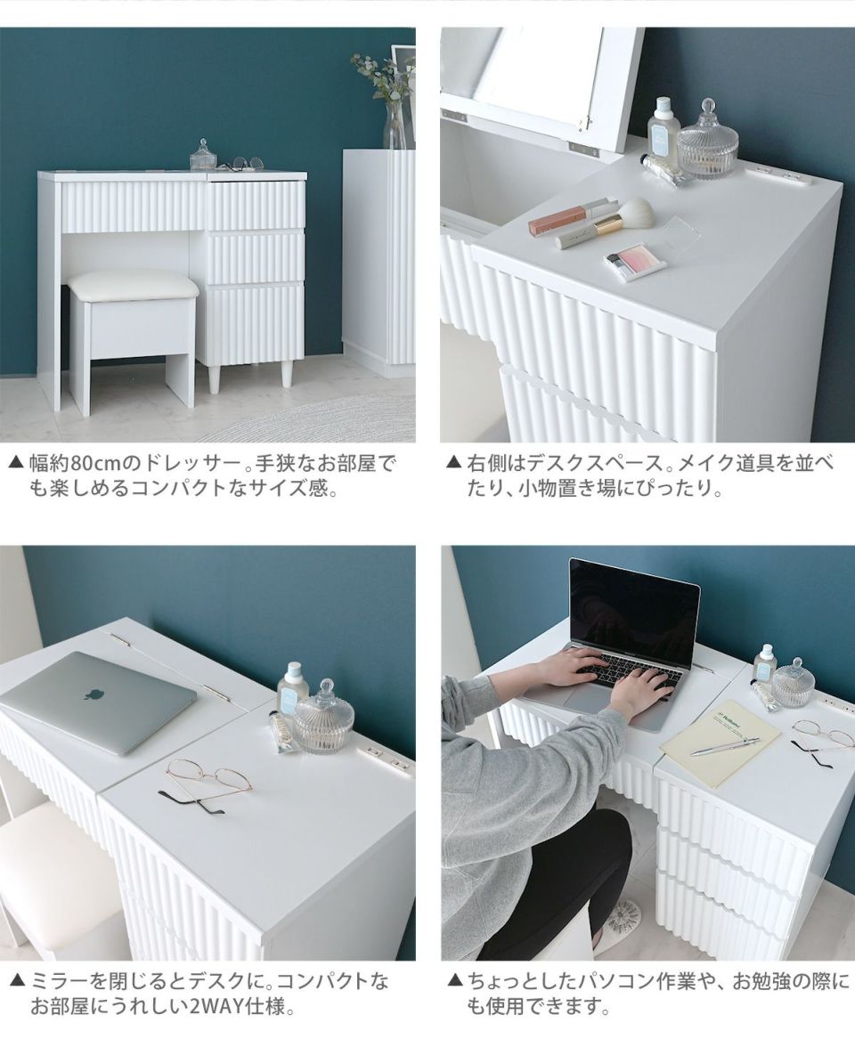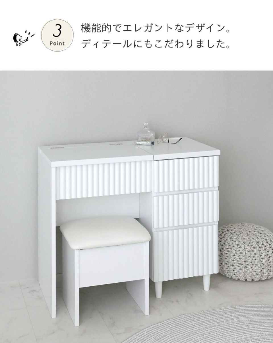取っ手のついていない、シンプルデザインがおしゃれなデスクドレッサーです。ごちゃっとしがちなメイク道具やヘアアイロンなどもすっきりと収納することができ、お部屋の生活感を隠すことができます。ミラーを閉じればデスクとしても使うことができ、様々なシーンに応じてマルチにお使いいただけるアイテムです。