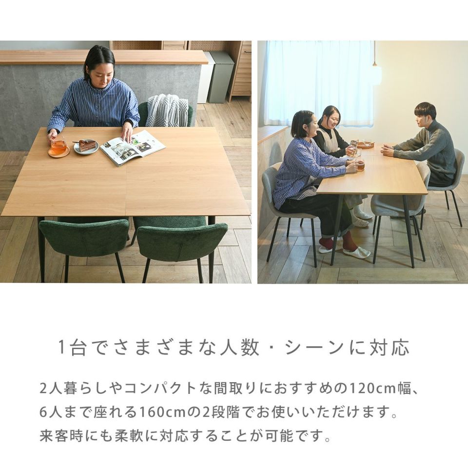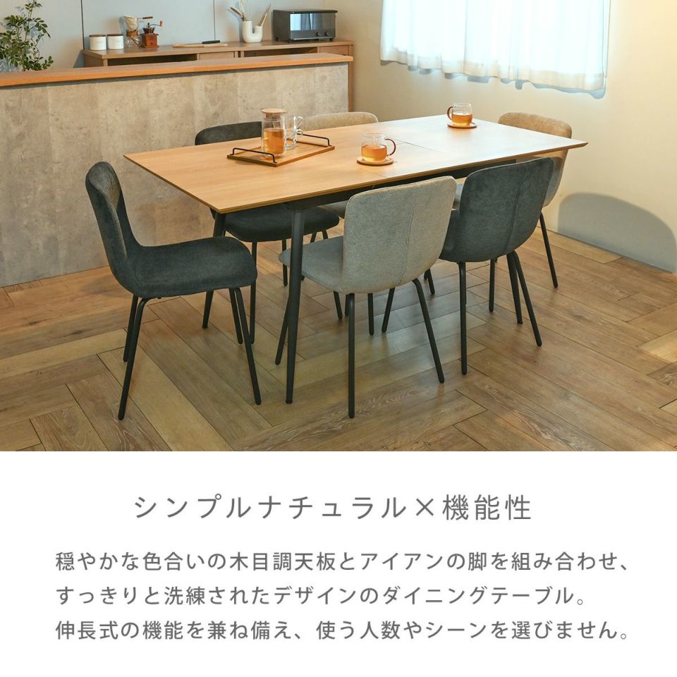 ナチュラルな木目調の天板とアイアンの脚の組み合わせ。使う人数に合わせて伸縮できるダイニングテーブル。
