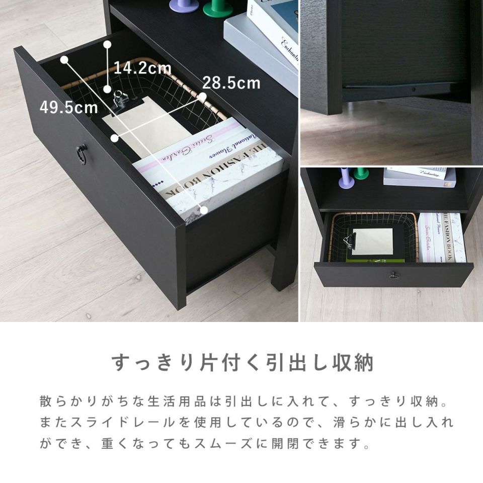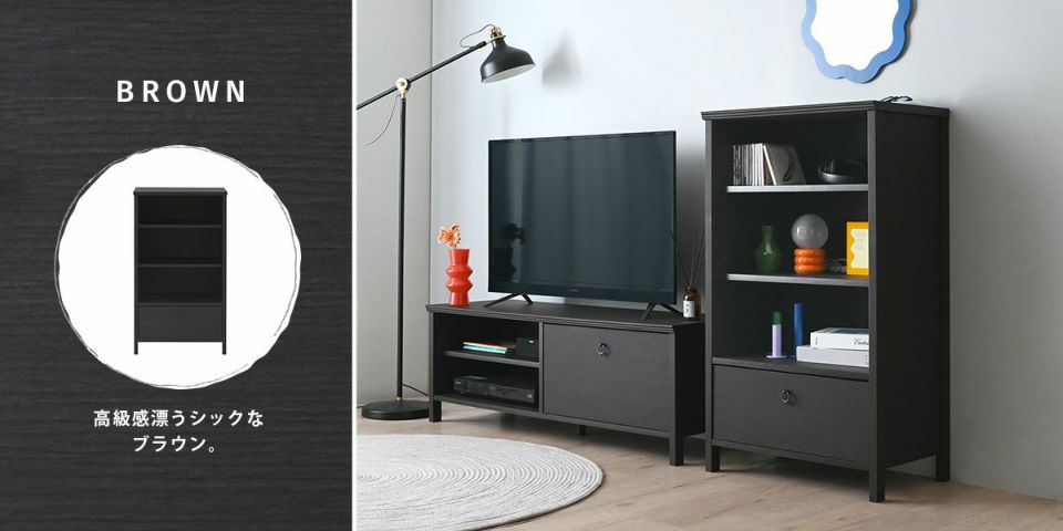 レトロな雰囲気とタイムレスなデザインがおしゃれなキャビネットです。天板には、細部にまでこだわった美しい木口のデザインが施されており、ヴィンテージ風の取っ手との相性も抜群です。オープン部分には、高さを変えられる移動棚がついており、書籍や雑誌、インテリア小物など、幅広いアイテムを収納できます。引き出し部分には、生活感のあるものもまとめて収納できるため、ごちゃごちゃしがちなリビングもすっきりと見せることができ、落ち着いたブラウンのカラーがお部屋に馴染みます。