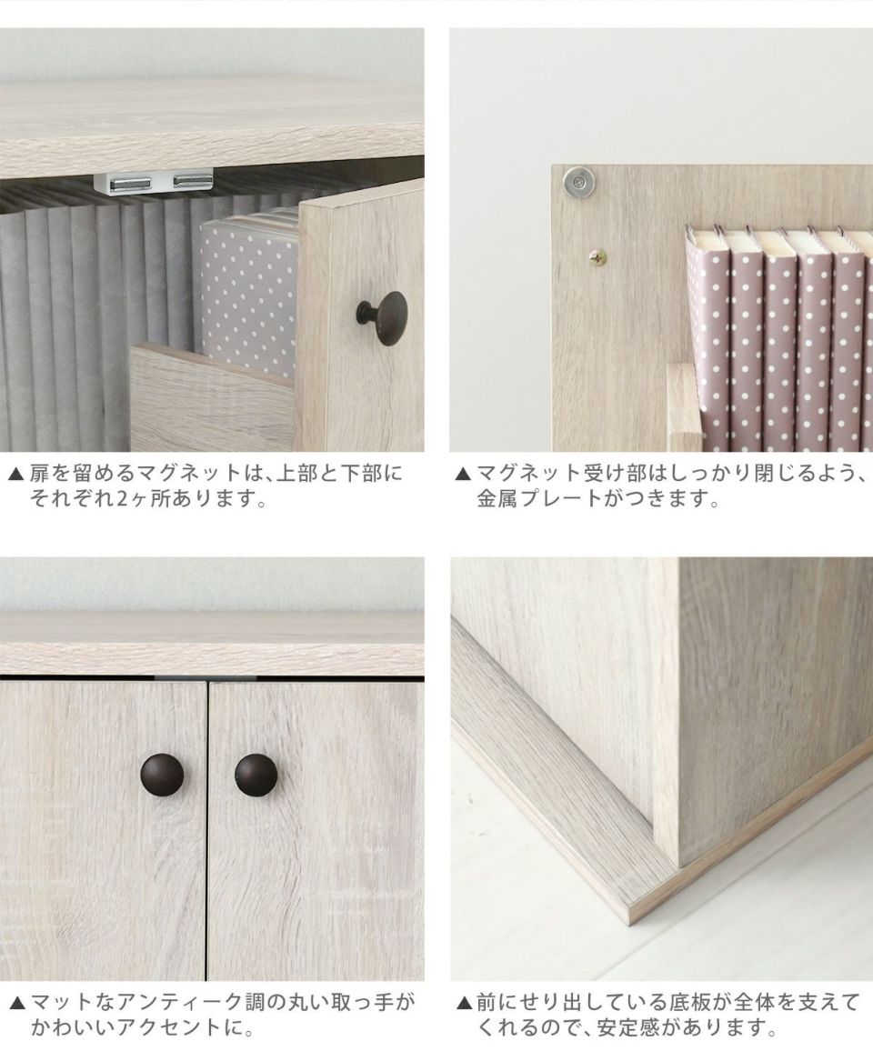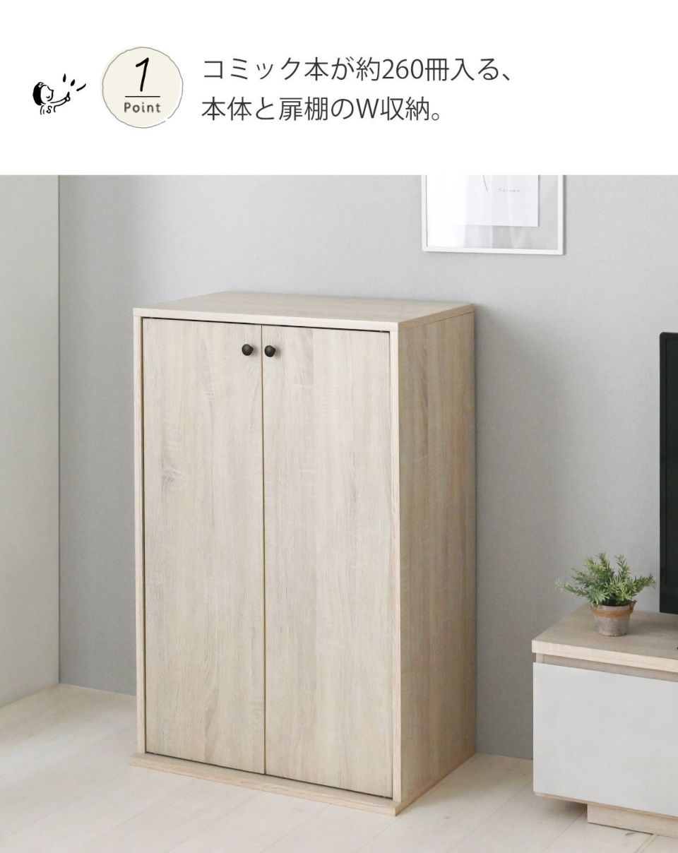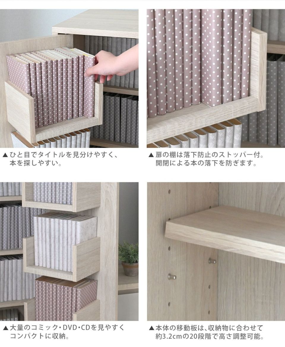 背表紙のごちゃつきを隠して、お部屋をすっきりと見せられる扉付きの本棚。マグネットでしっかり閉まり、日焼けやホコリの侵入も防ぎます。本体には奥行き約14cmの3枚の移動棚付き。扉の内側にも収納できて、ひと目でタイトルを見分けやすい。落下防止のストッパー付きで、開閉による本の落下を防ぎます。コミック本が260冊以上収納できます。