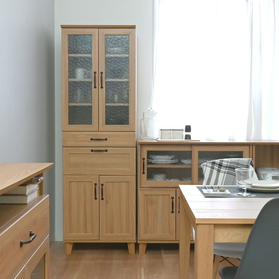 北欧テイストの高さ180cmハイタイプの食器棚。幅58cmとスリムなのでキッチンで場所を取らず、調理器具も置けて便利。ナチュラル天板に木目調ホワイトのコンビがかわいい、REBISTO(リビスト)。しっかりとした大きさで、食器や鍋やフライパン、食材などのストック等、たくさん収納できるハイタイプのキッチン収納。高さ10cmの脚下空間で掃除も楽々。インテリア、フレンチカントリー、ナチュラルテイストがお好きな方におすすめ。