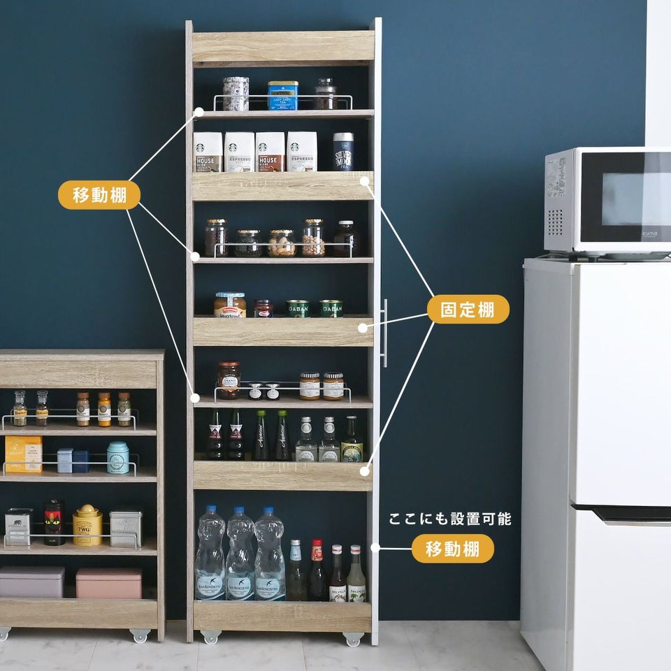 キッチンや冷蔵庫のちょっとしたすき間にすっきりと収納できる、ハイタイプのキッチン収納です。調味料や缶詰などの収納はもちろん、水や瓶などの高さのある物もまとめて収納できます。キャスター付きなので移動もラクラクで、シンプルなデザインがお部屋になじみます。