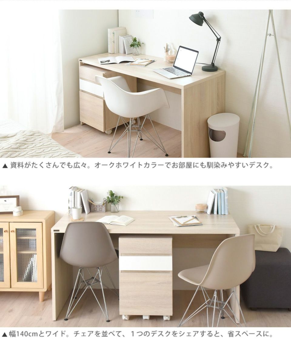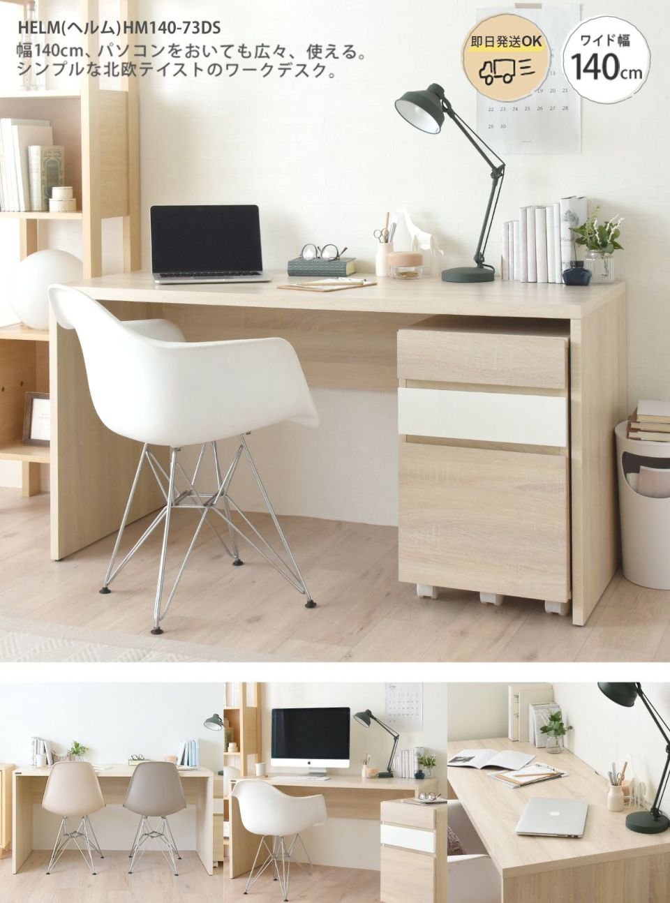 幅140cmとパソコンをおいても余裕なワークデスク。 天板部分はPVC仕様で、フラットでさらっとした質感。木目を活かし、落ち着いた北欧テイストあふれる印象に。シンプルながら、強度面にもこだわりました。北欧テイストやホワイトインテリアが好きな方におすすめ。