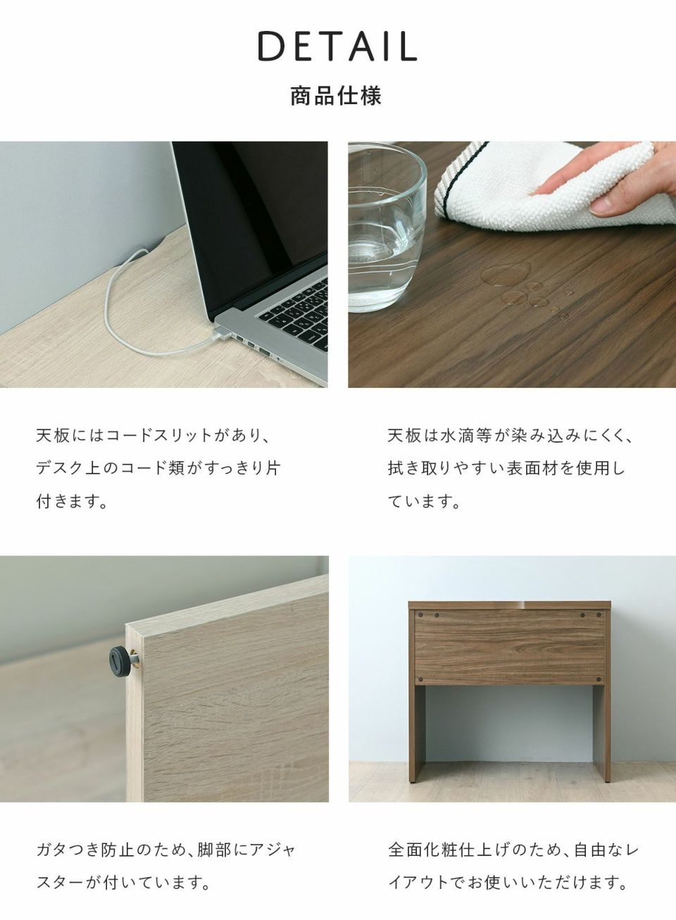 シンプルでスリムだけど、安定感のある構造。しっかり使える幅80cmのデスク。