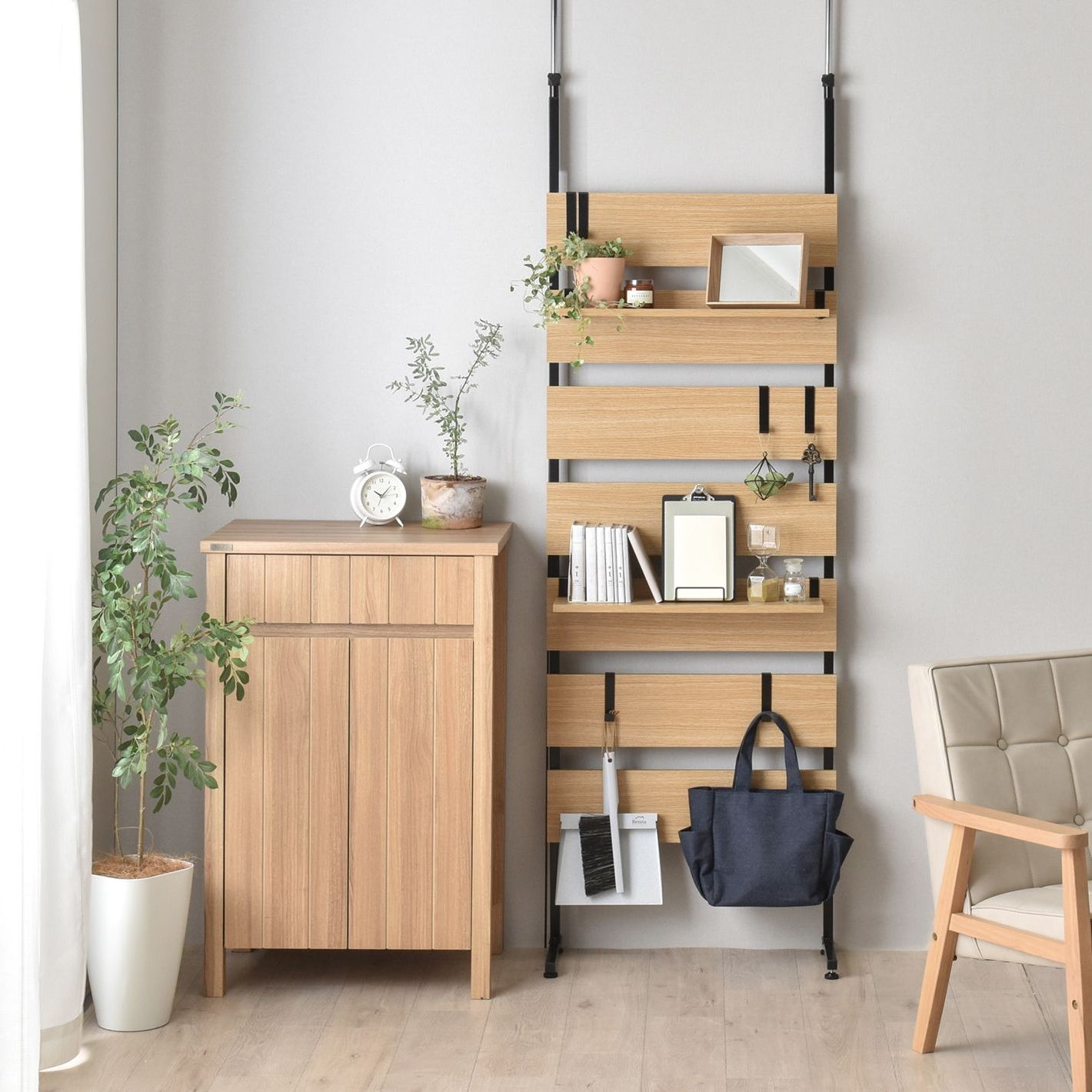 ハンガーラックがセットになった収納棚は、クローゼットがない部屋にぴったりのアイテムです。