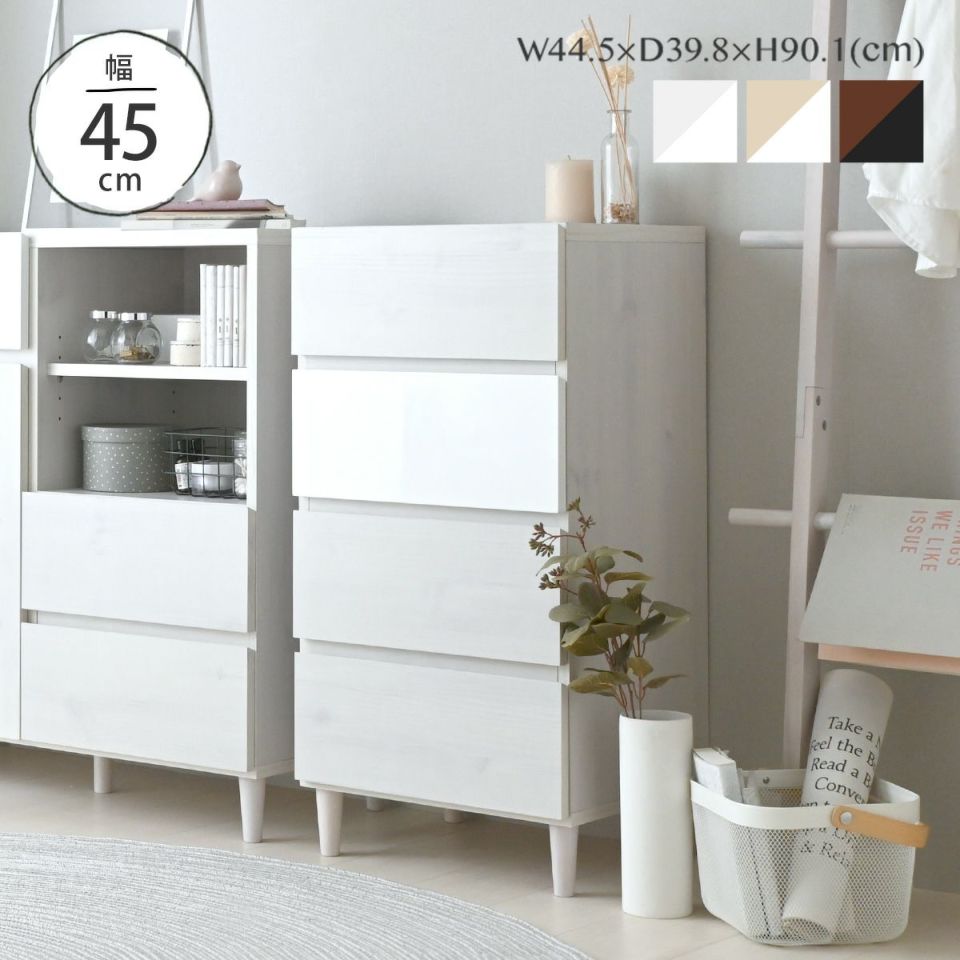 幅45cmのスリム設計で、ワンルームや6畳の部屋でも無理なく設置でき、ちょっとした隙間を有効活用できます。4つの引き出しには衣類や下着、タオルなどをきれいに分類して収納できるため、毎日の整理整頓がスムーズに。