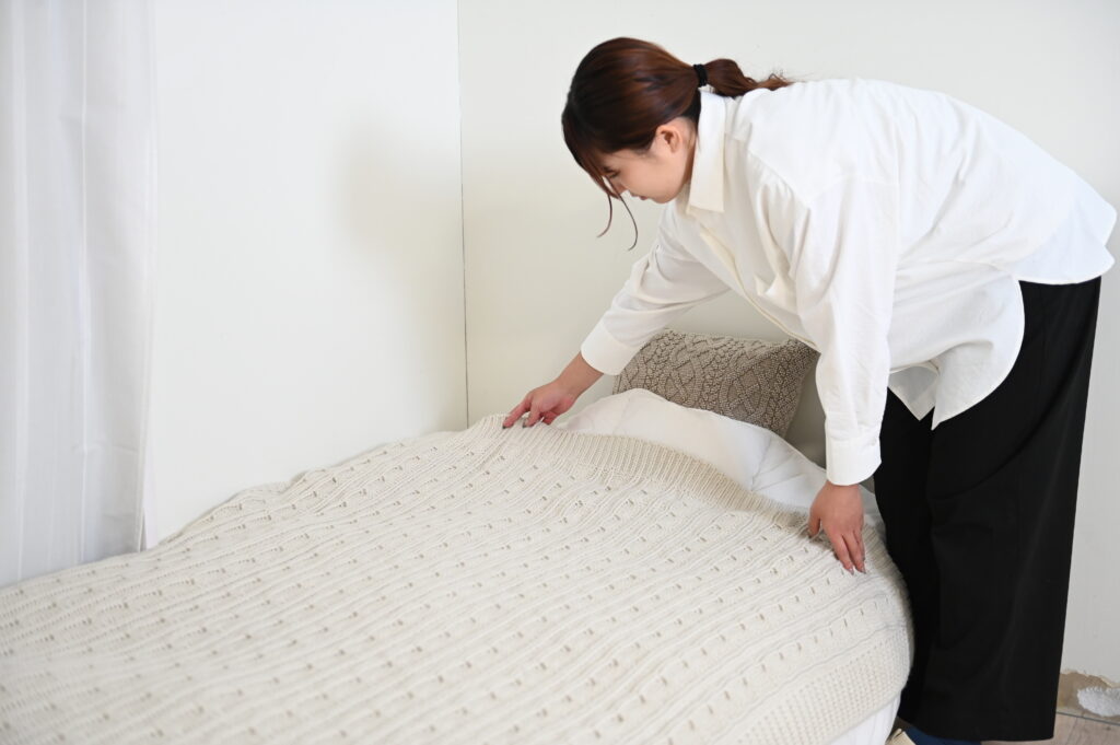 部屋のスペースを大きく取るベッド周りは、韓国インテリア定番の白やベージュカラーで統一。