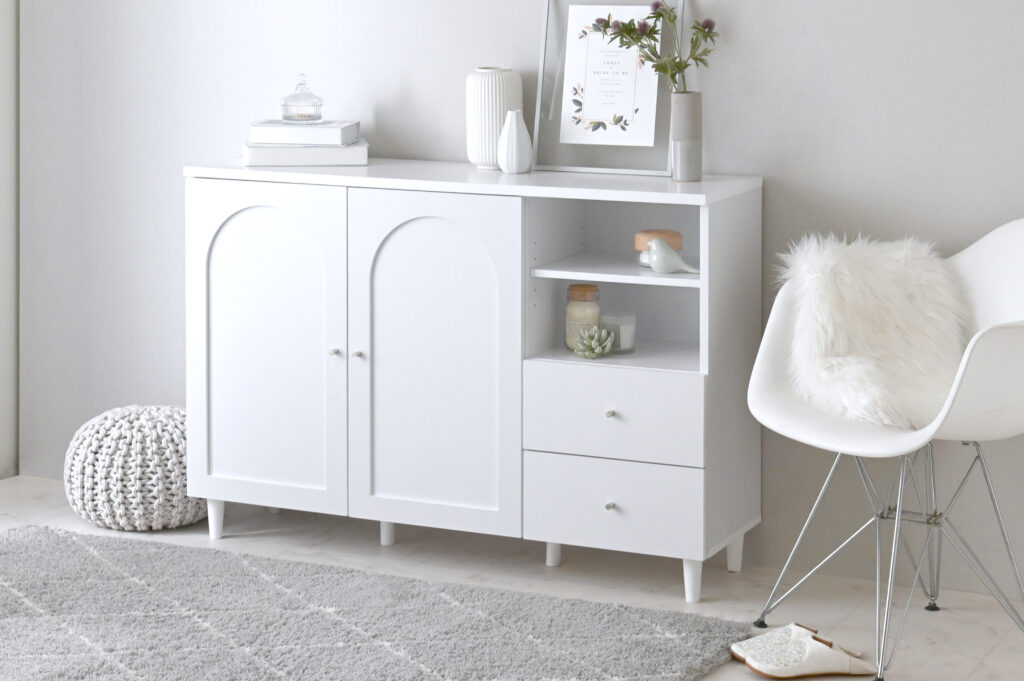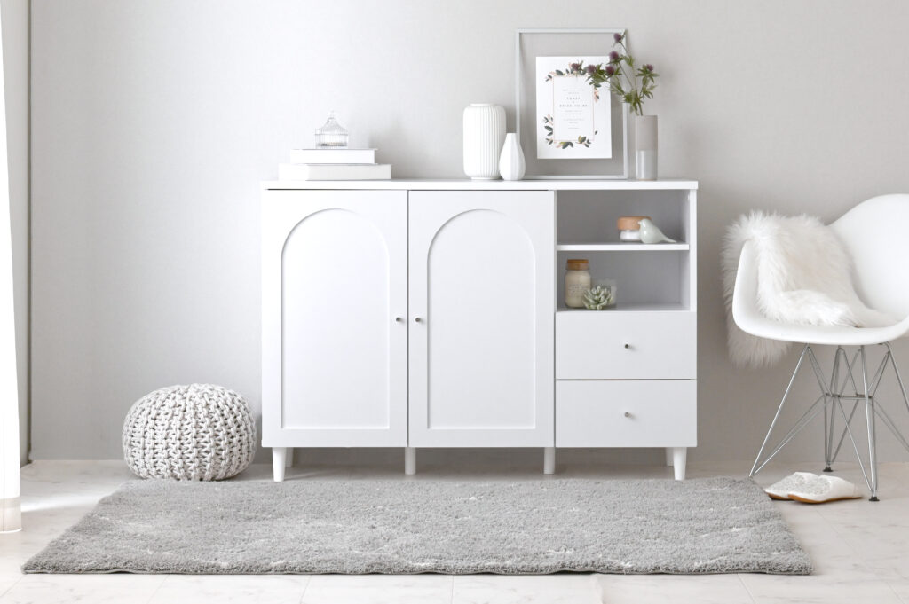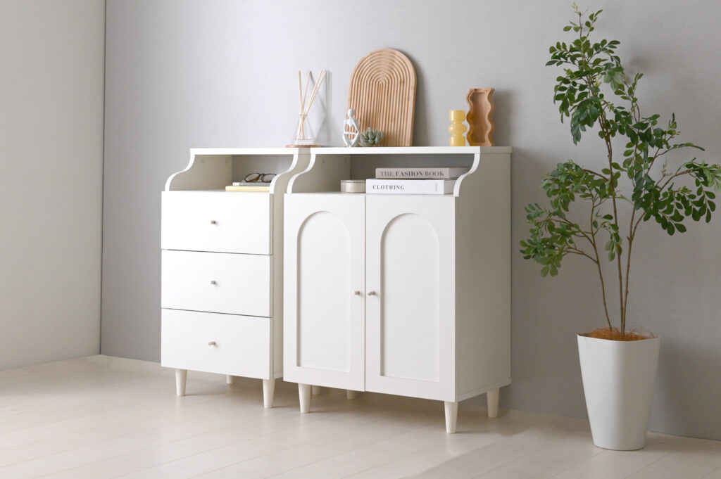 曲線の柔らかなフォルムと大人っぽいラタン扉が、個性的でこなれた雰囲気を演出します。