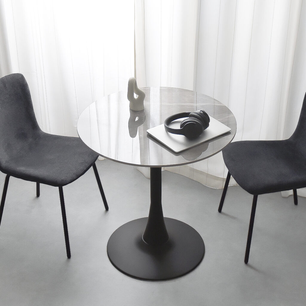 大理石調のラウンド天板×ブラックスチール脚が高級感を演出し、奥だけで空間が一気にグレードアップするでしょう。